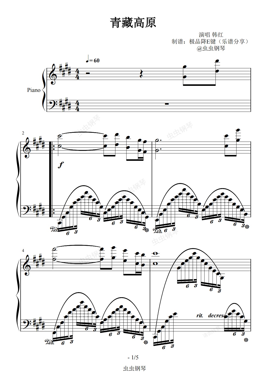 钢琴谱:青藏高原(韩红)2022倾心优化