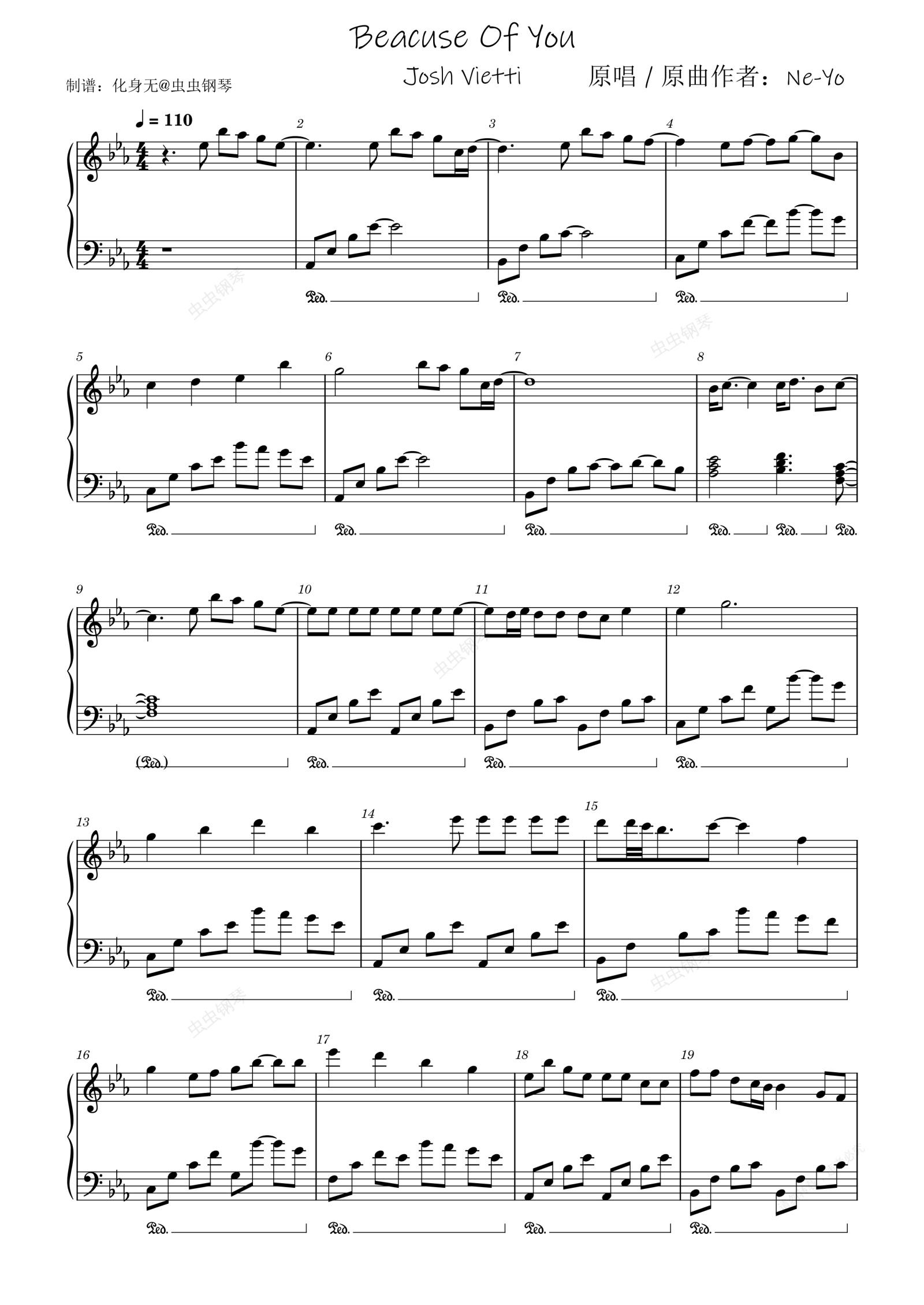 钢琴谱:Because of You 原调独奏版