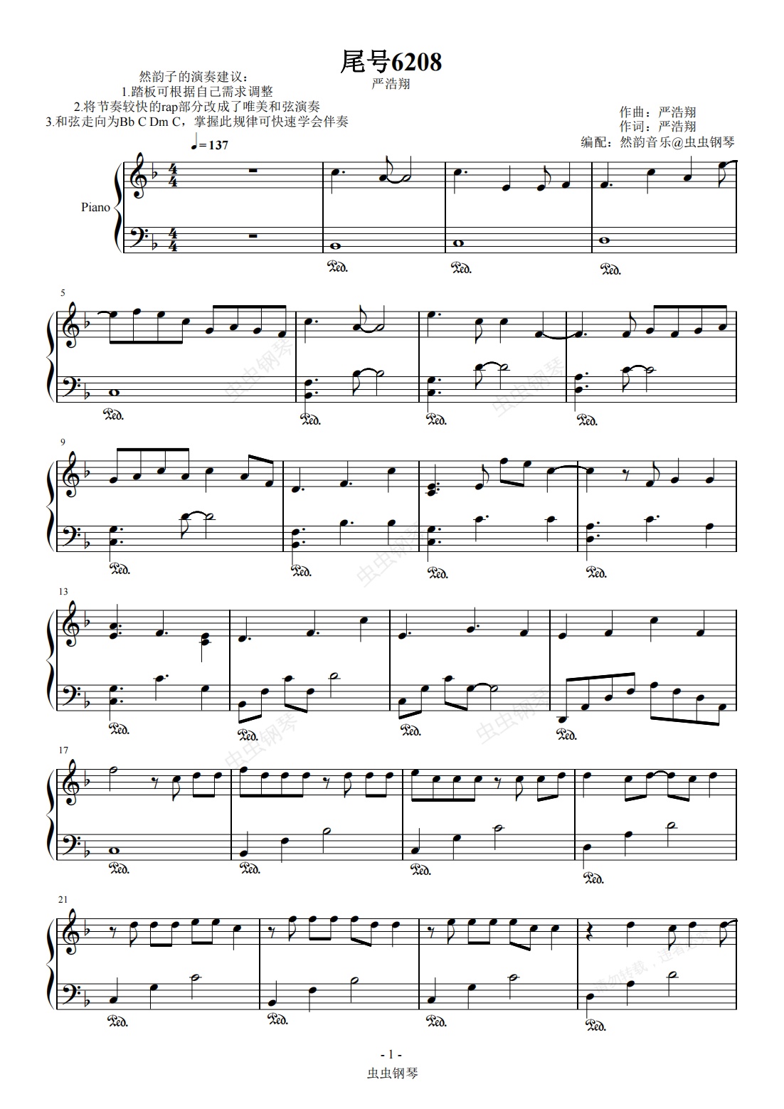 钢琴谱:【原调免费】尾号6208-严浩翔 简单易学 然韵音乐编配 TNT时代少年团