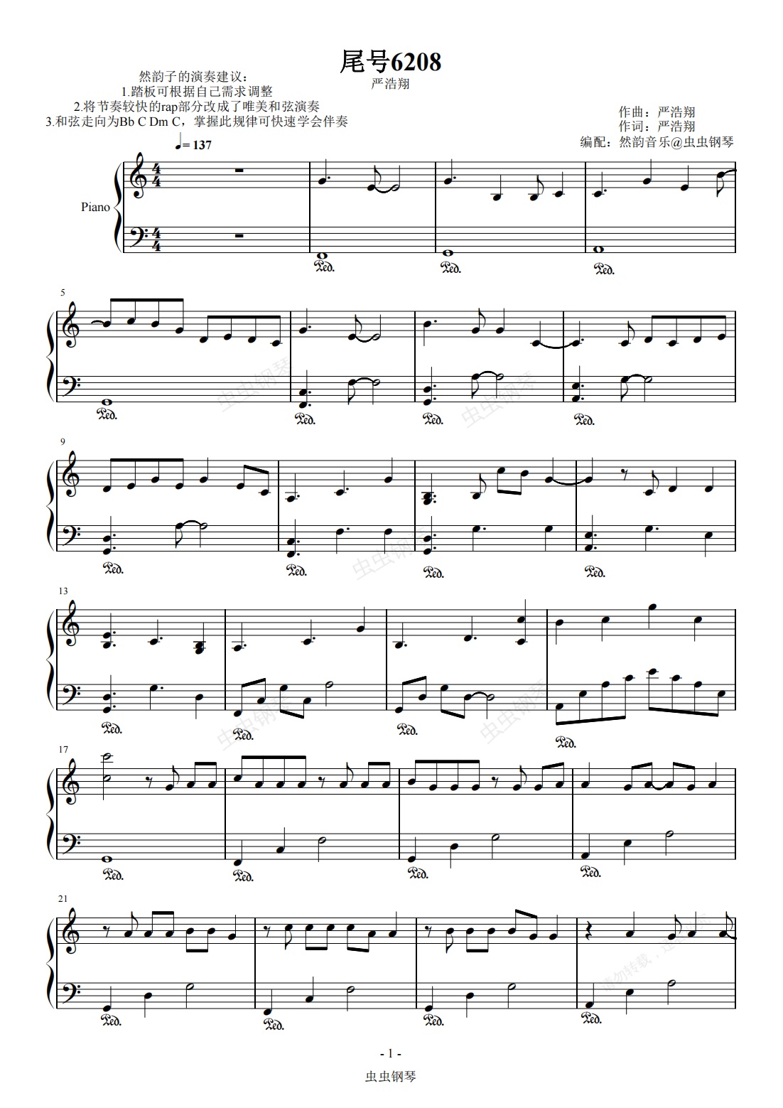 钢琴谱:【C调特惠】尾号6208-严浩翔 简单易学 然韵音乐编配 TNT时代少年团