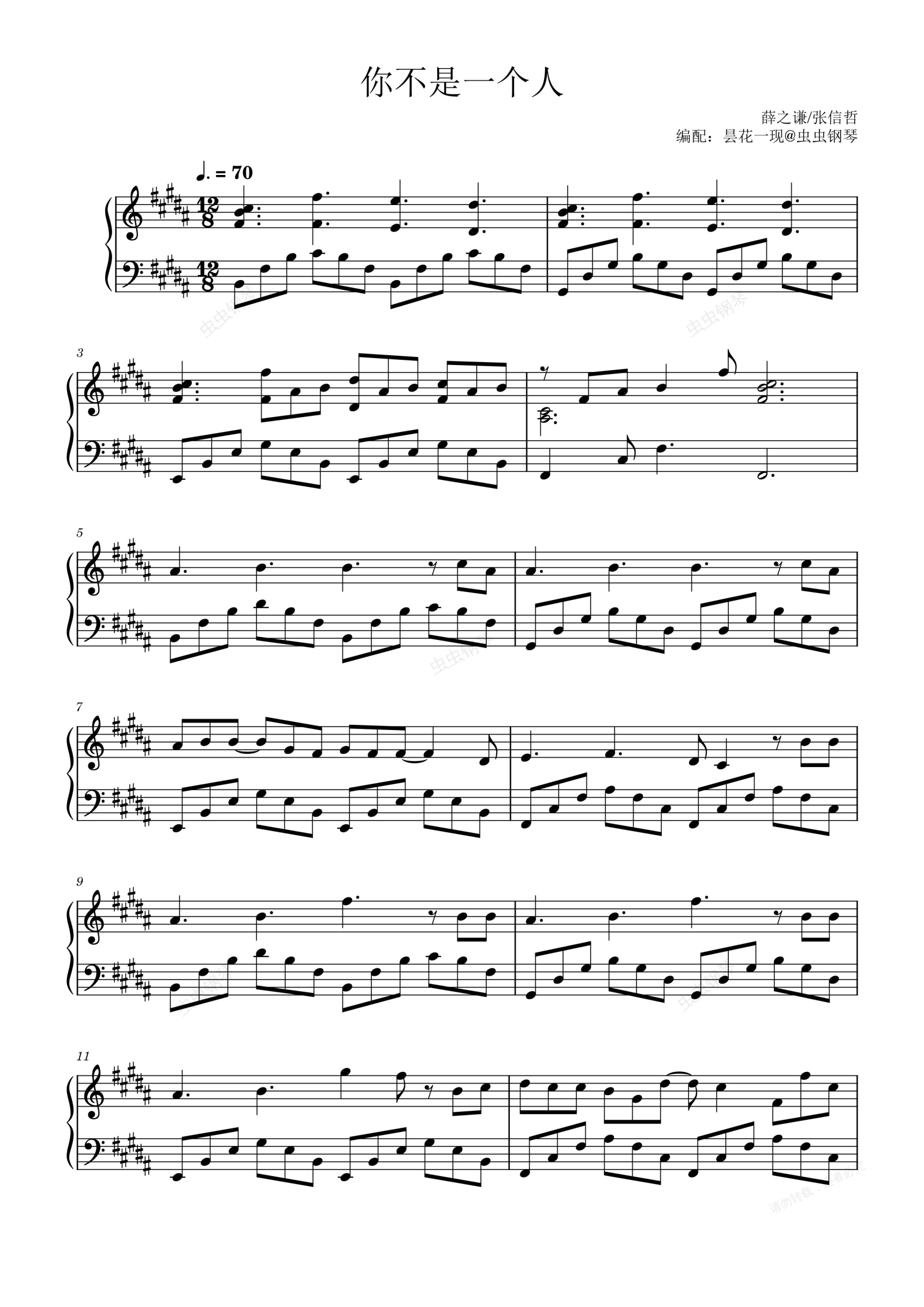 钢琴谱:你不是一个人 薛之谦/张信哲