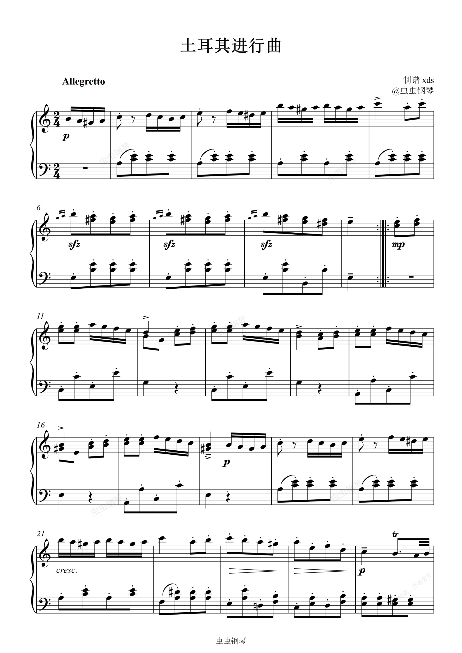主题脍炙人口,成为莫扎特钢琴奏鸣曲的代表作,第一主题,曲调轻盈活泼、节奏富于弹性。乐曲中段富于东方色彩明朗而雄壮的进行曲,主题音调节奏铿锵有力,气势雄伟使人豁然开朗。它与第一乐段形成强烈对比。第二小乐段几乎全由十六分音符构成快速旋律,仿佛队伍在急速飞快地奔跑。第三小乐段十六分音符构成的快速旋律,顺着第二小乐段的旋律一泻而来不可阻挡。第四小乐段它与第一小乐段完全相同,重复了这一乐段富于东方色彩雄壮的进行曲。乐曲结尾部分比较长,是以进行曲风格的音调为素材加以变化发展而成。曲调使乐曲显得壮丽辉煌、气势磅礴,不断推向高潮结束全曲。