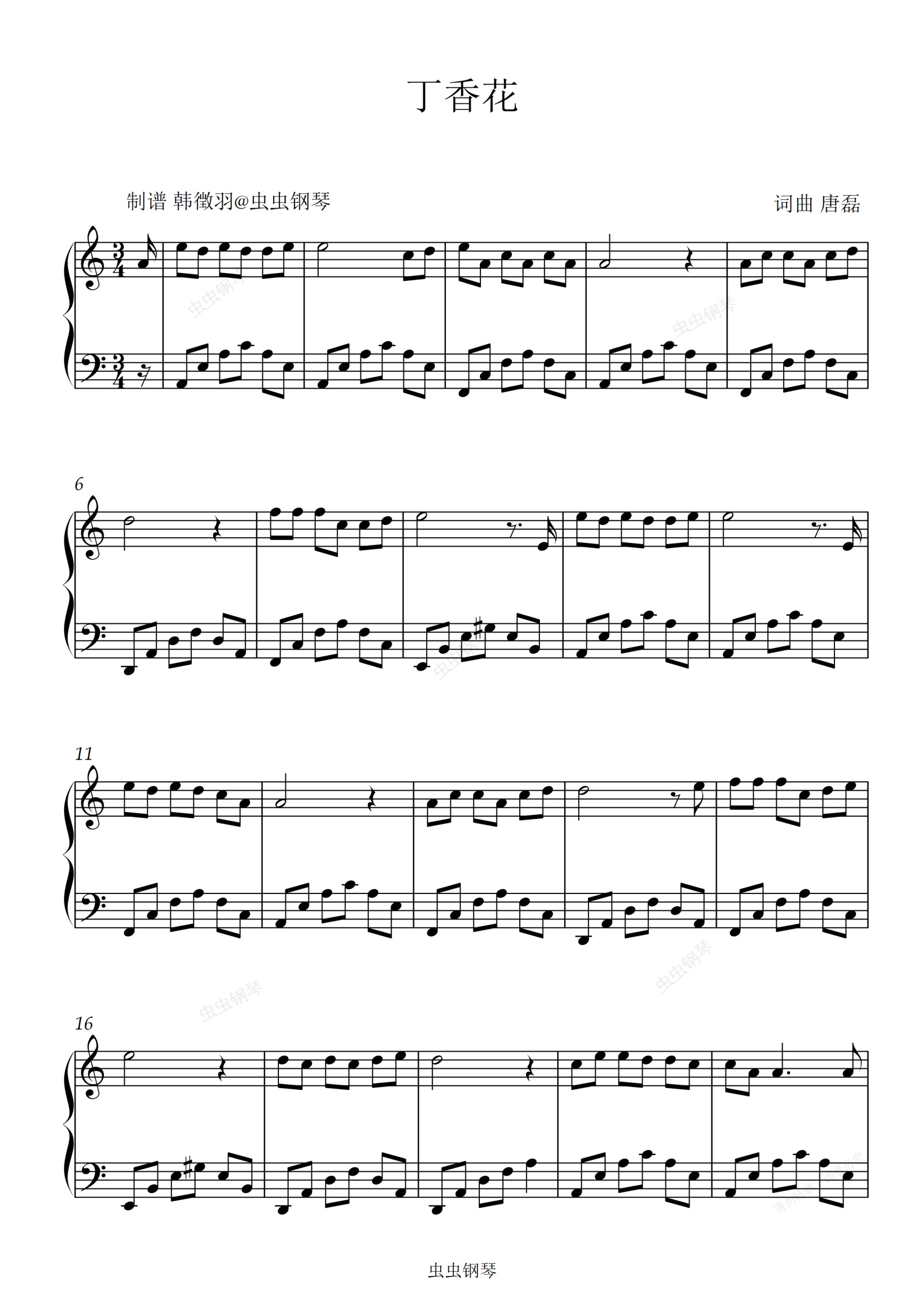 钢琴谱:丁香花 唐磊 C调简单易弹