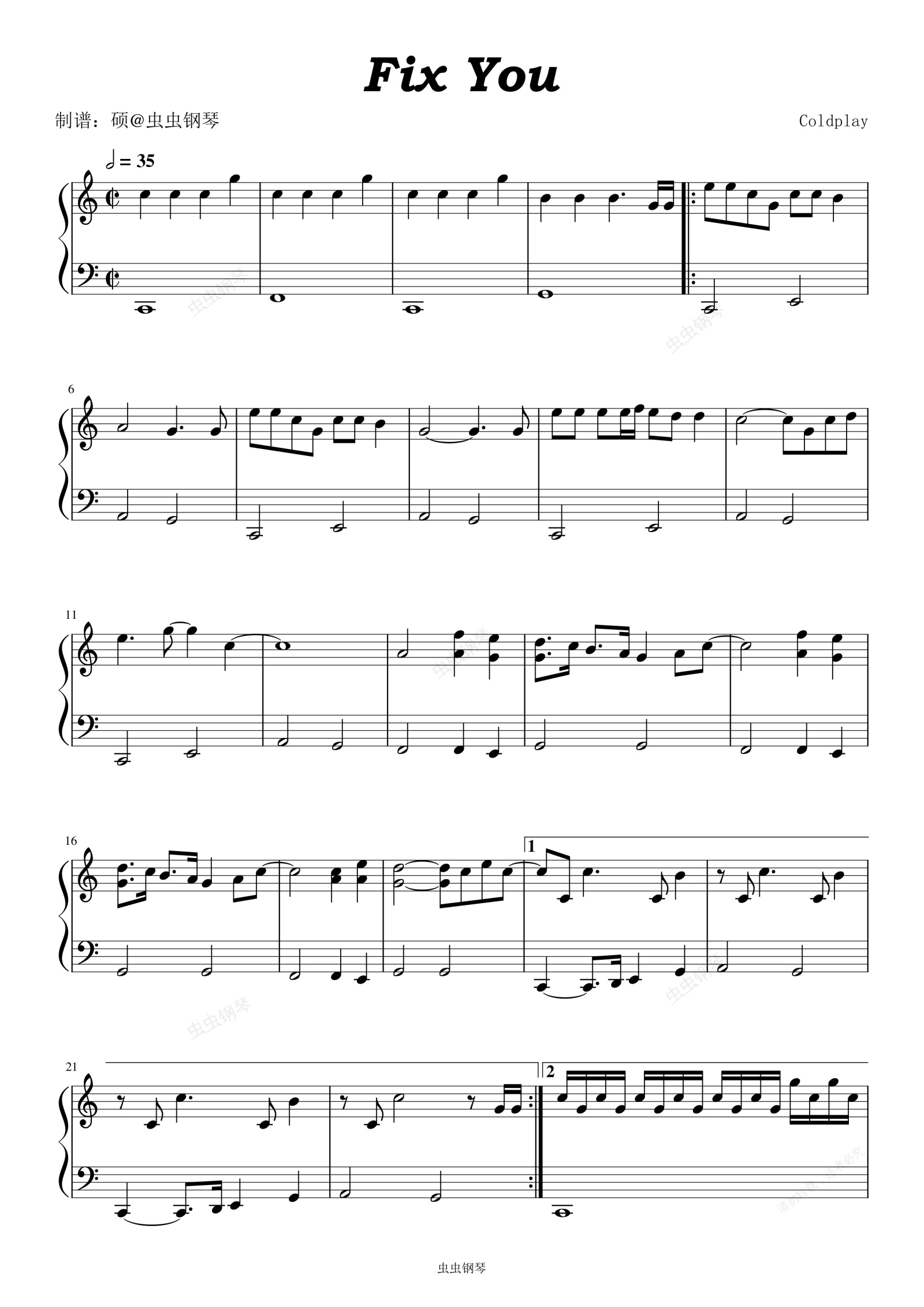钢琴谱:Fix You - Coldplay (酷玩乐队)