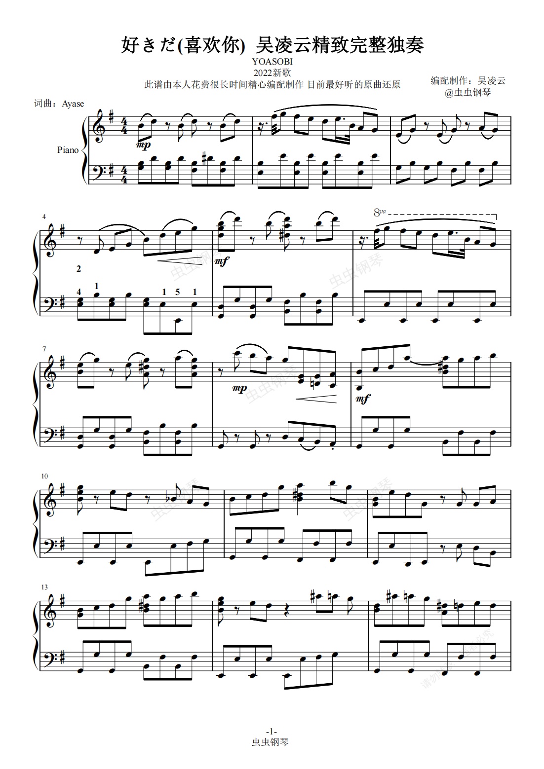 钢琴谱:好きだ(喜欢你) YOASOBI 2022年新歌 吴凌云精致完整独奏