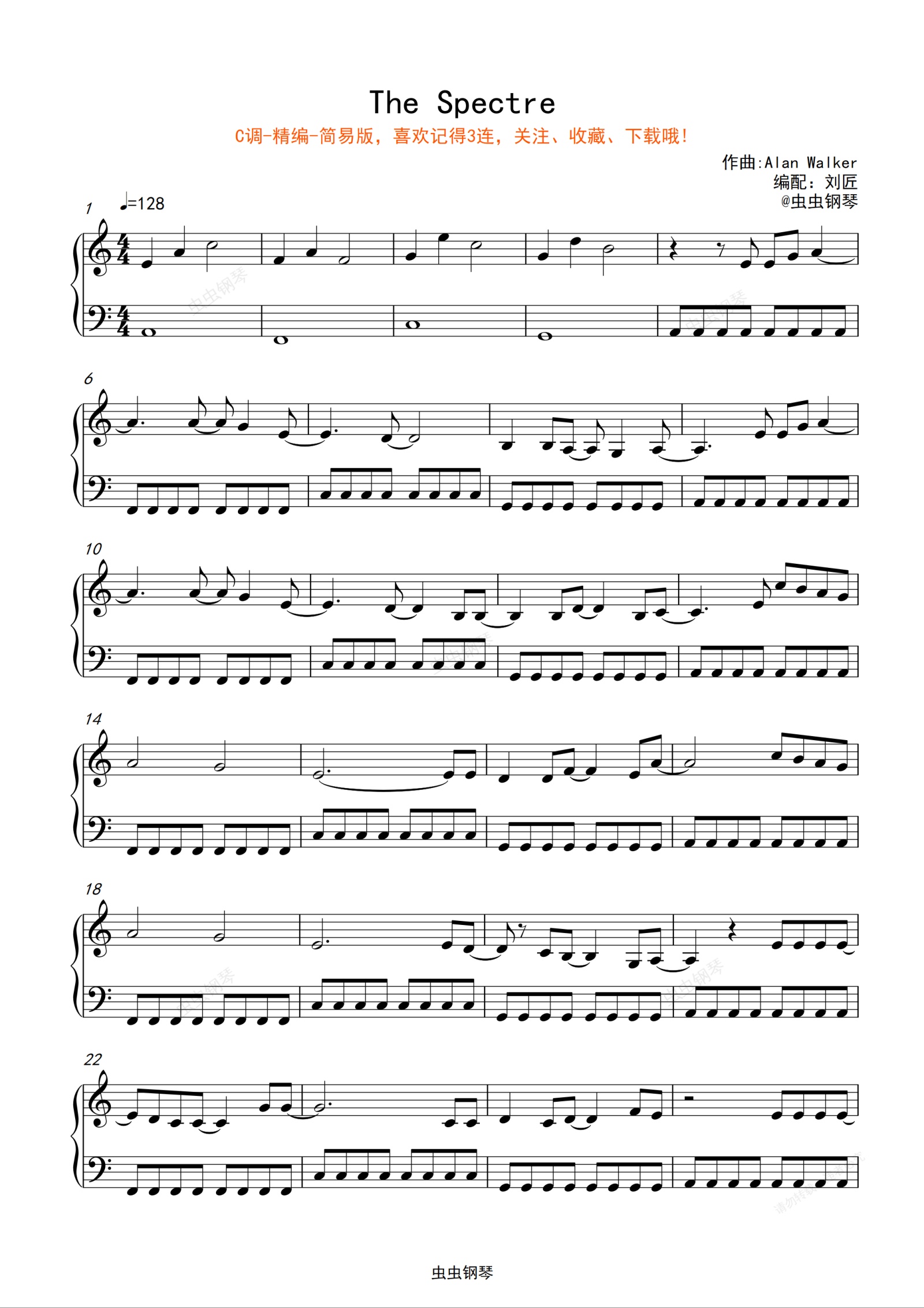 钢琴谱:【收藏+关注】The Spectre-刘匠制谱-C调好弹版