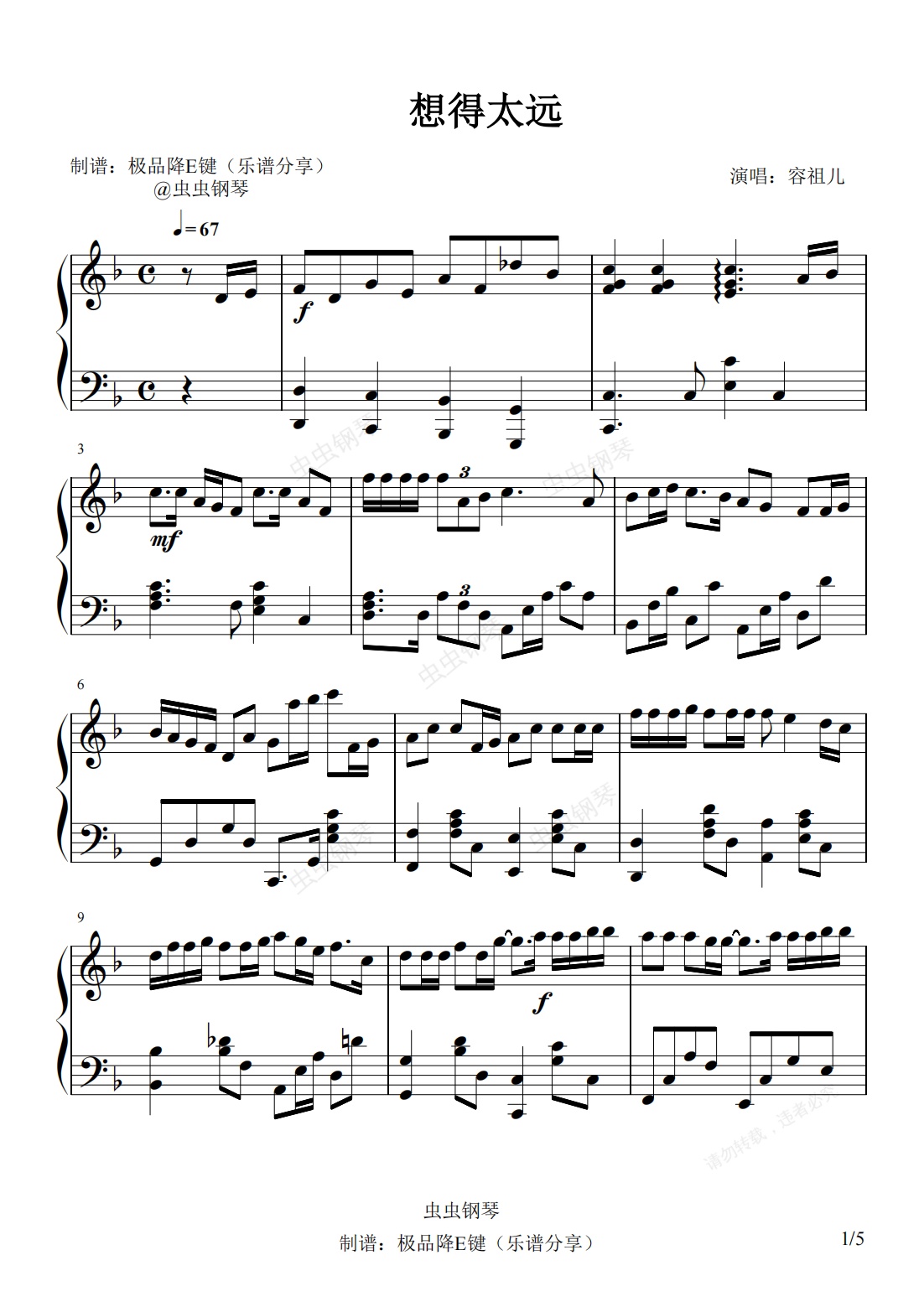 钢琴谱:想得太远(容祖儿)