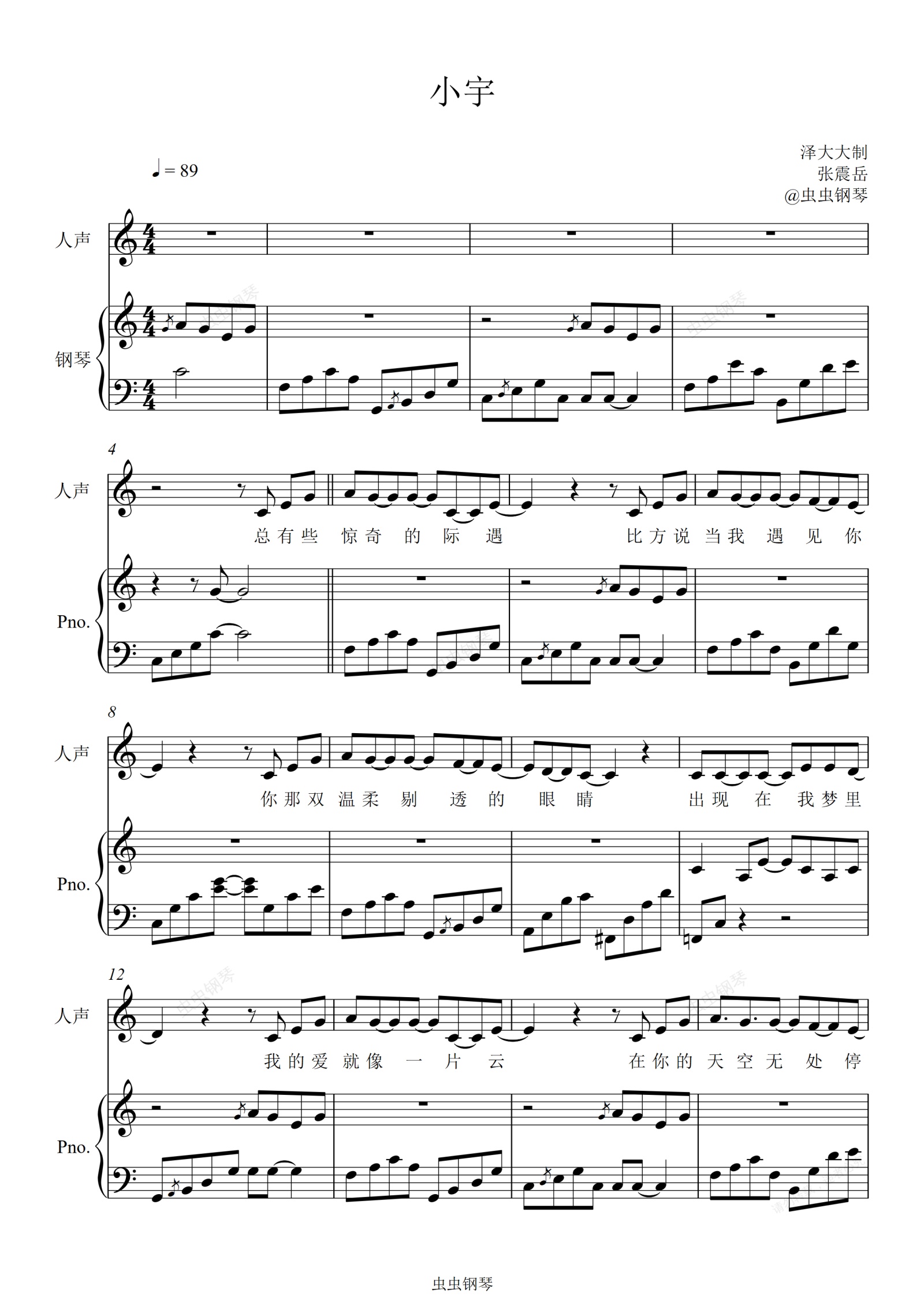 钢琴谱:小宇【C调完美弹唱附词】泽大大 张震岳