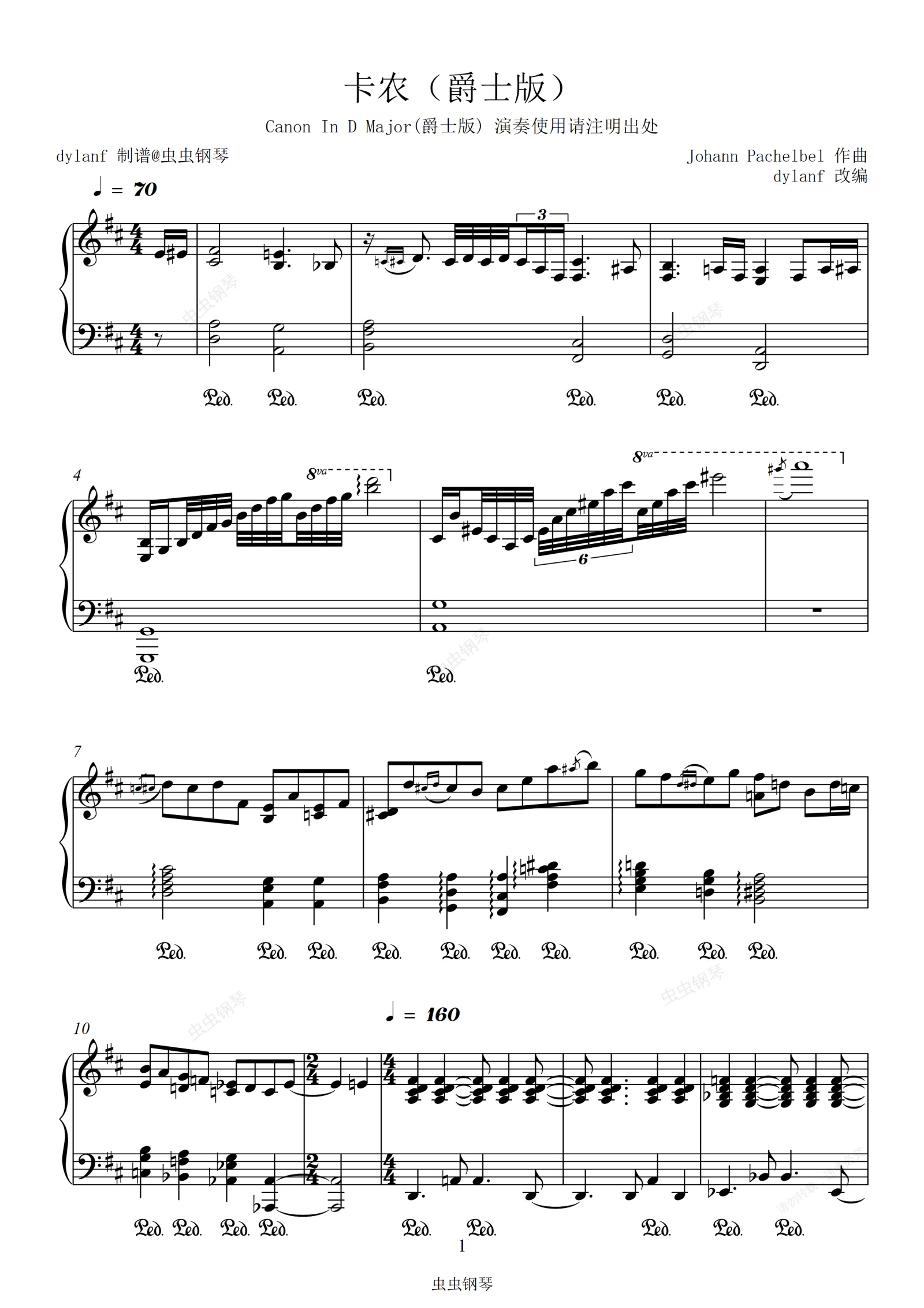 钢琴谱:卡农(爵士版)浪漫优雅dylanf经典卡农Canon in D Major D大调卡农