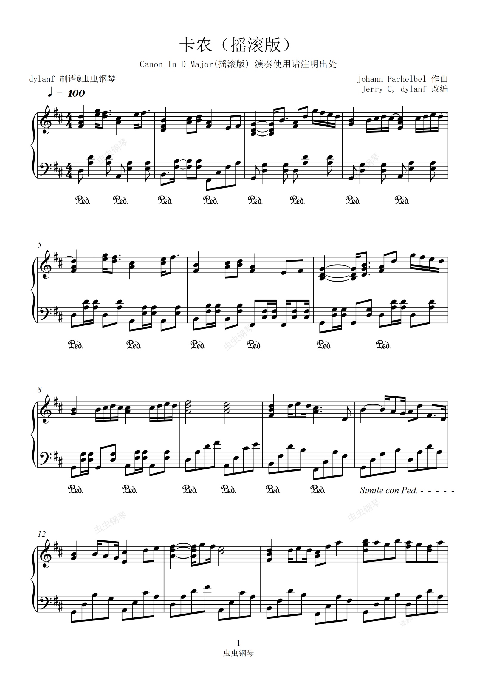 钢琴谱:卡农(摇滚版)超燃热血dylanf经典卡农Canon in D Major张逸凡Jerry C D大调卡农