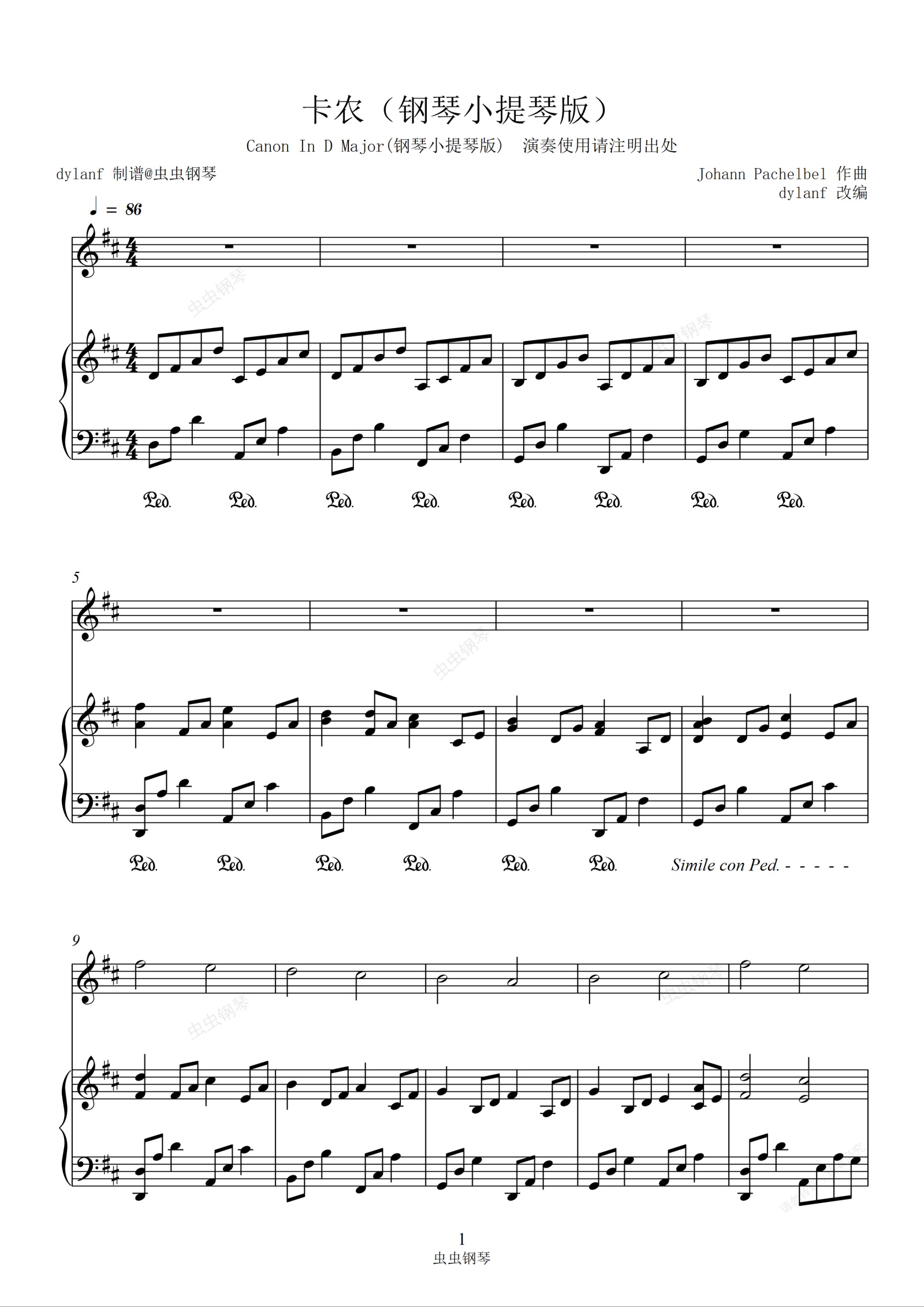 钢琴谱:卡农(钢琴小提琴版)浪漫爱情dylanf经典卡农Canon in D Major D大调卡农