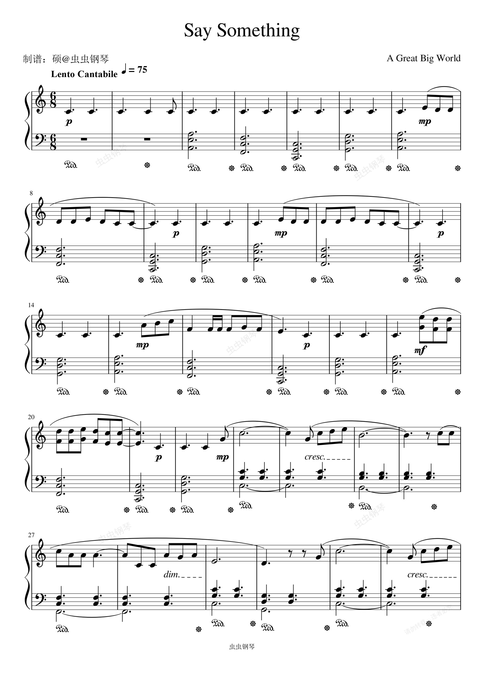 钢琴谱:Say Something - A Great Big World/Christina Aguilera (克里斯蒂娜·阿奎莱拉)