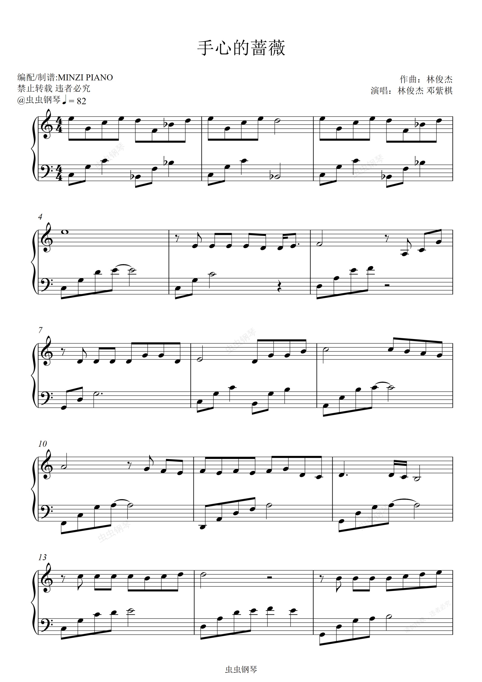 钢琴谱:林俊杰 邓紫棋《手心的蔷薇》C调 好听易弹