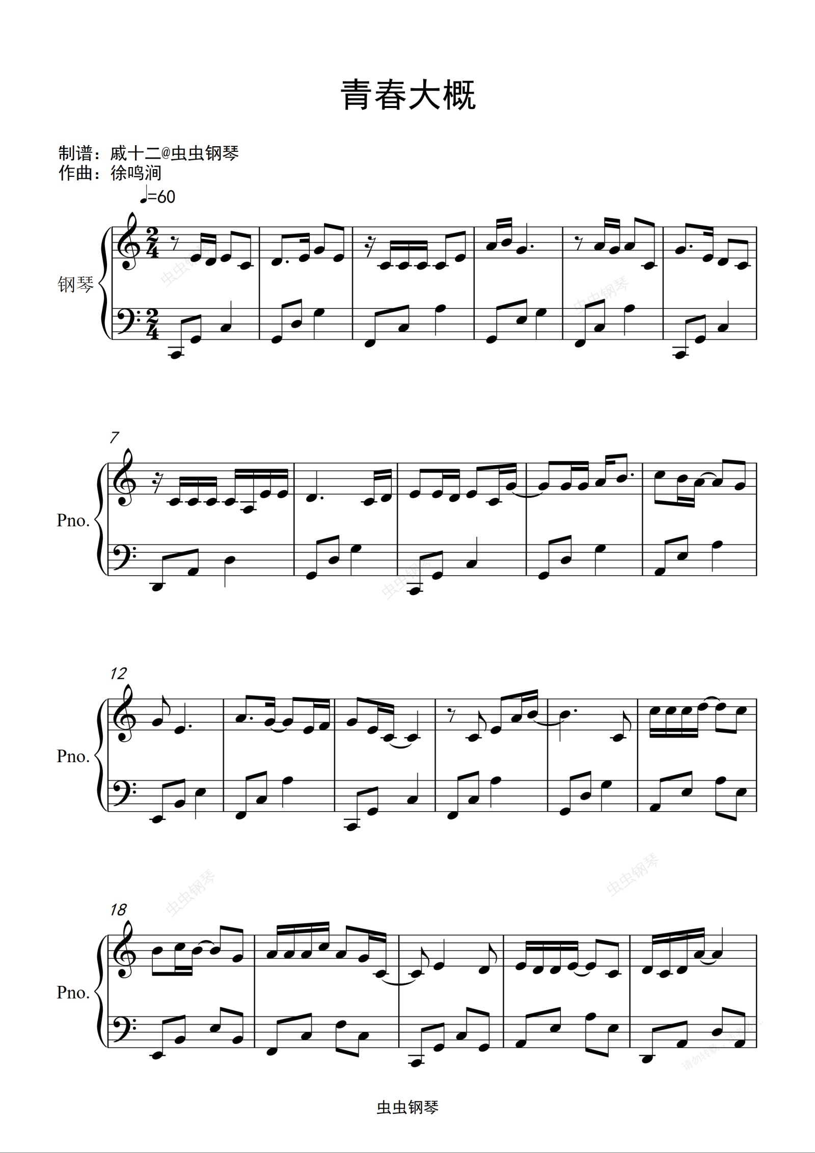 钢琴谱:青春大概-C调简单版