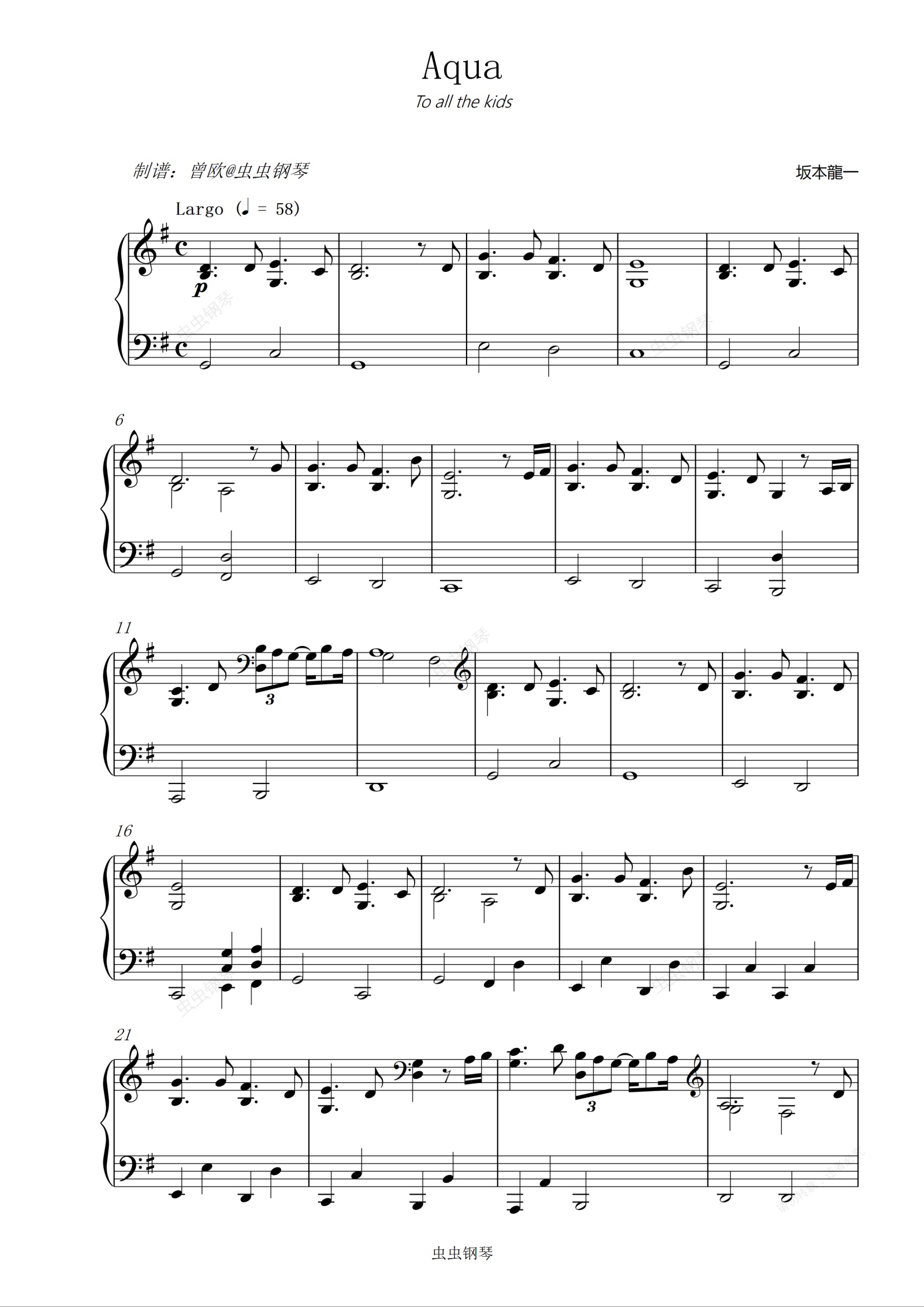 钢琴谱:Aqua - 坂本龙一 (为疫情期间的中国公众与孩子们演奏)