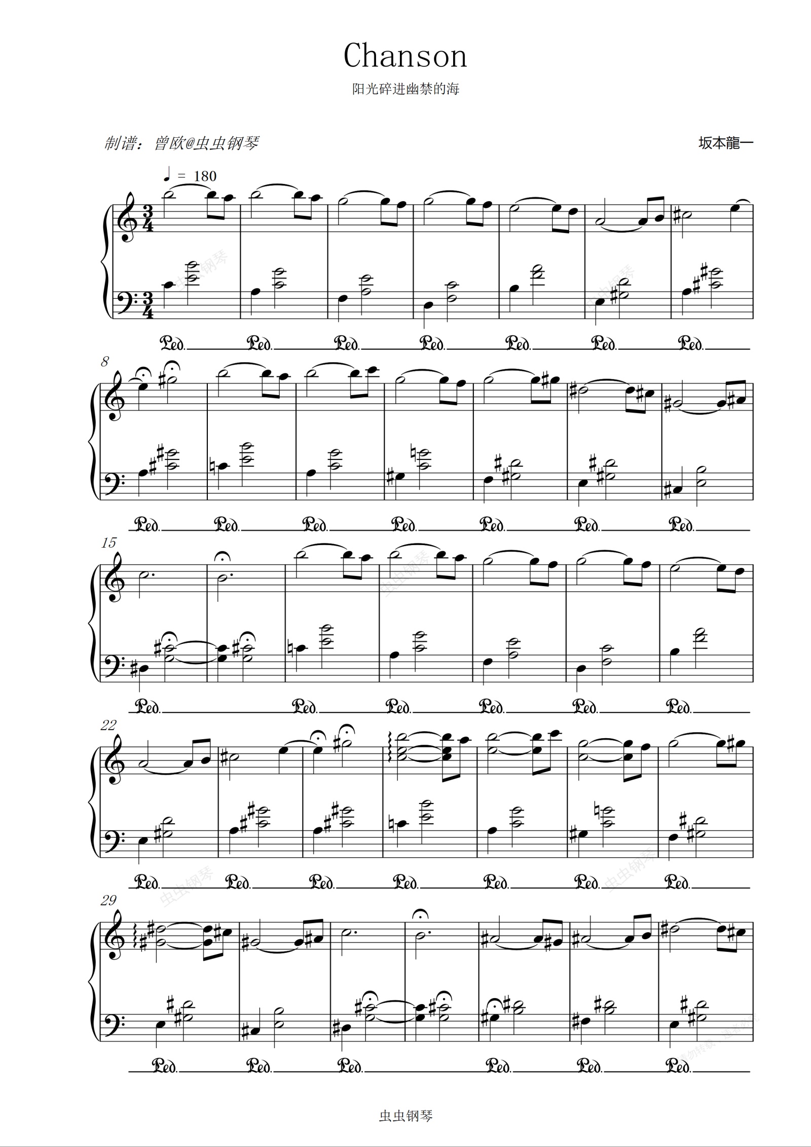钢琴谱:Chanson - 坂本龙一【像阳光碎进幽禁的海】