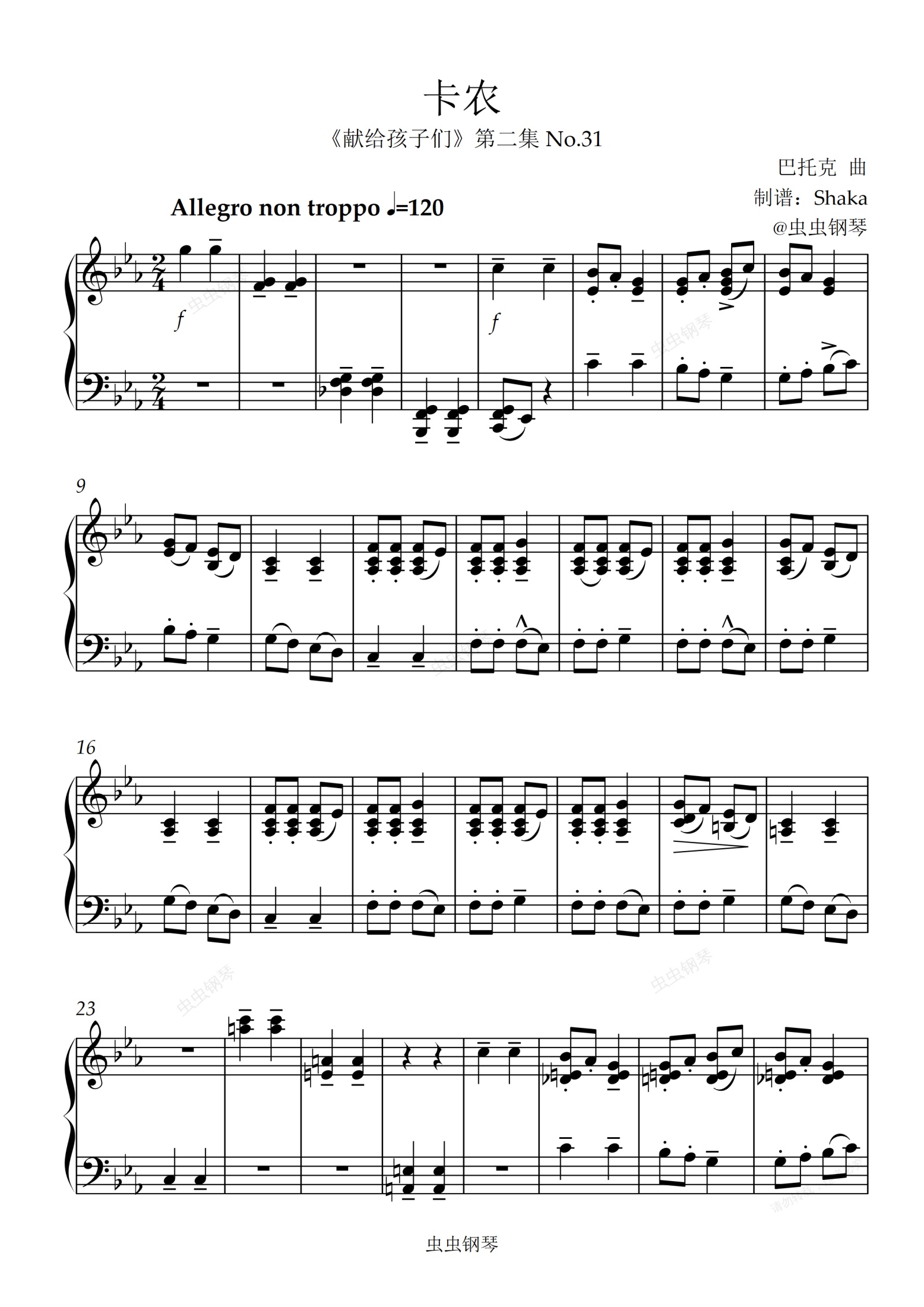 钢琴谱:卡农 巴托克 c调版 ZYY 考级曲目