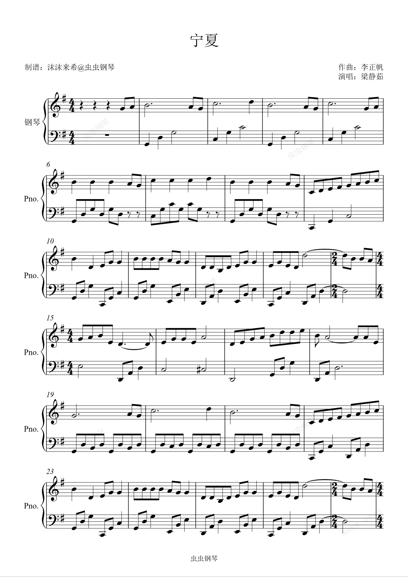 钢琴谱:《宁夏》梁静茹 G调 简单 好听 适合初学者
