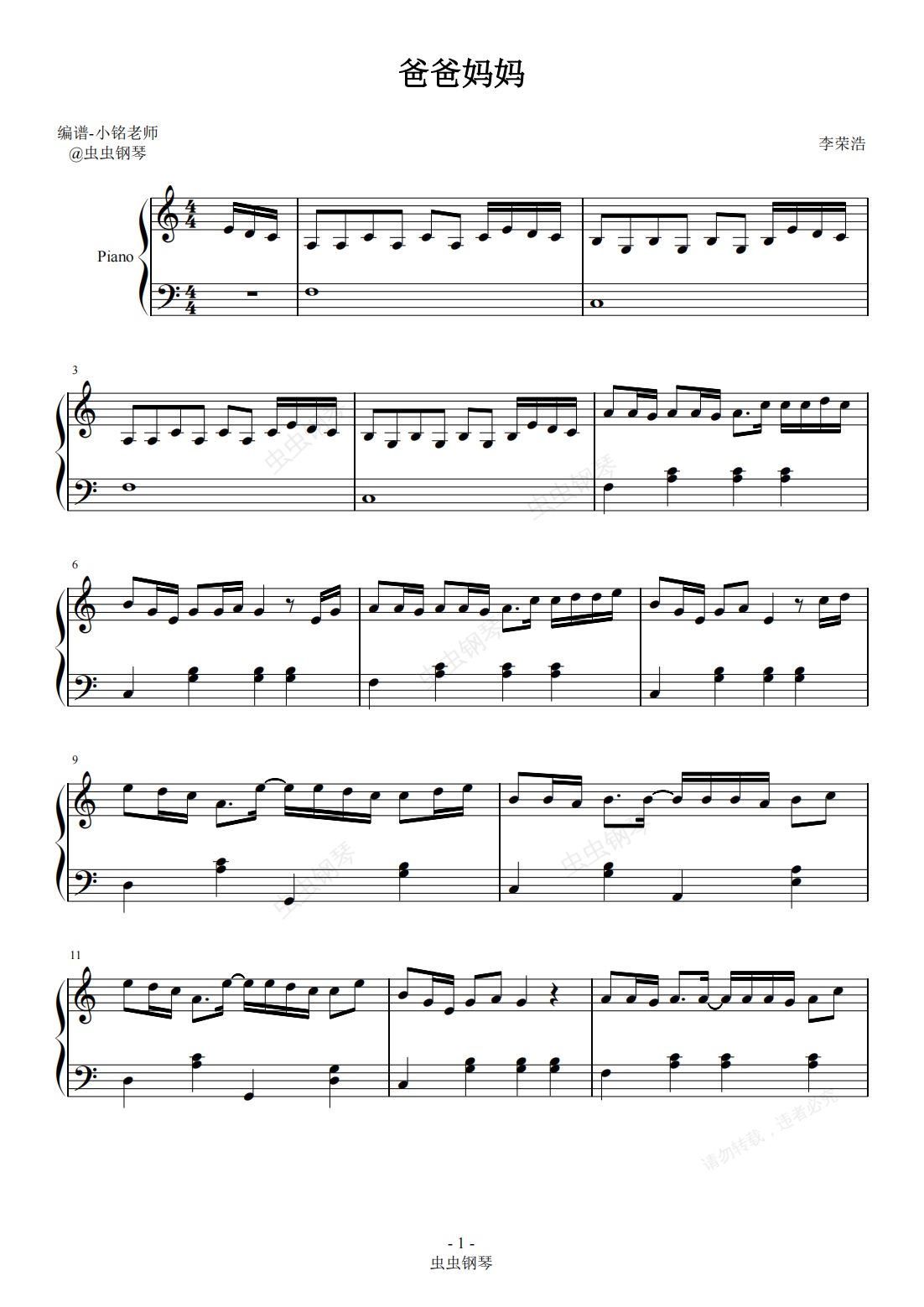 钢琴谱:爸爸妈妈 【简易 动听版】