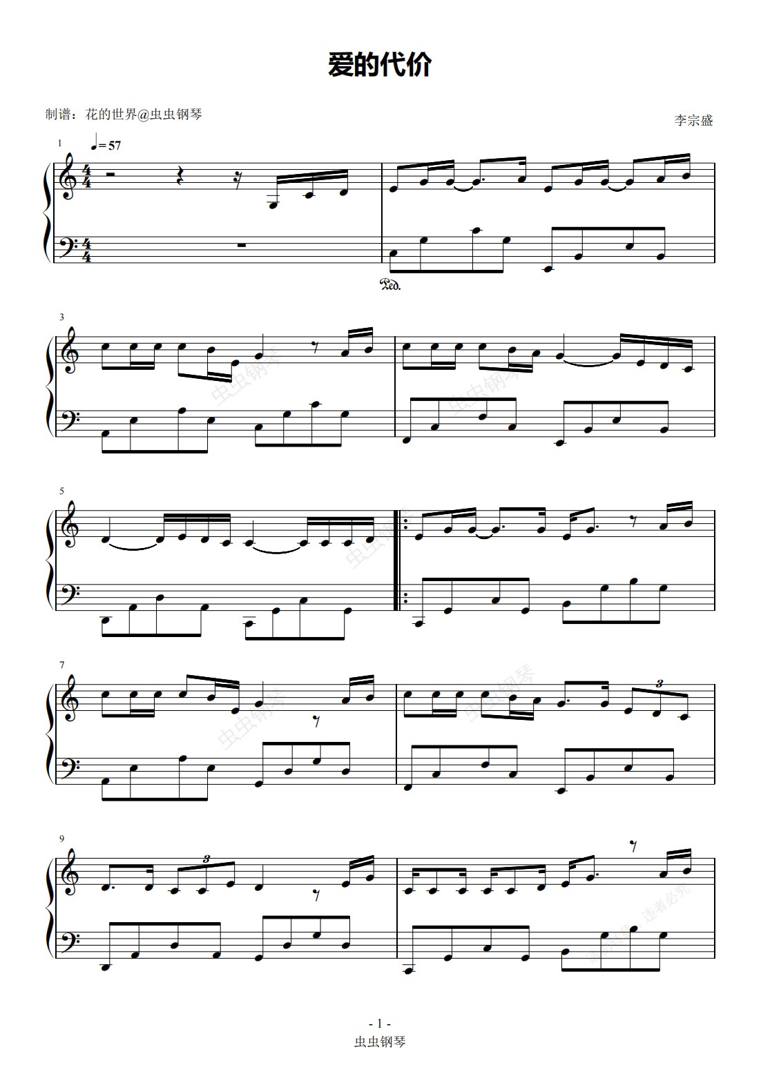 钢琴谱:爱的代价 C调简易版本 张艾嘉/李宗盛