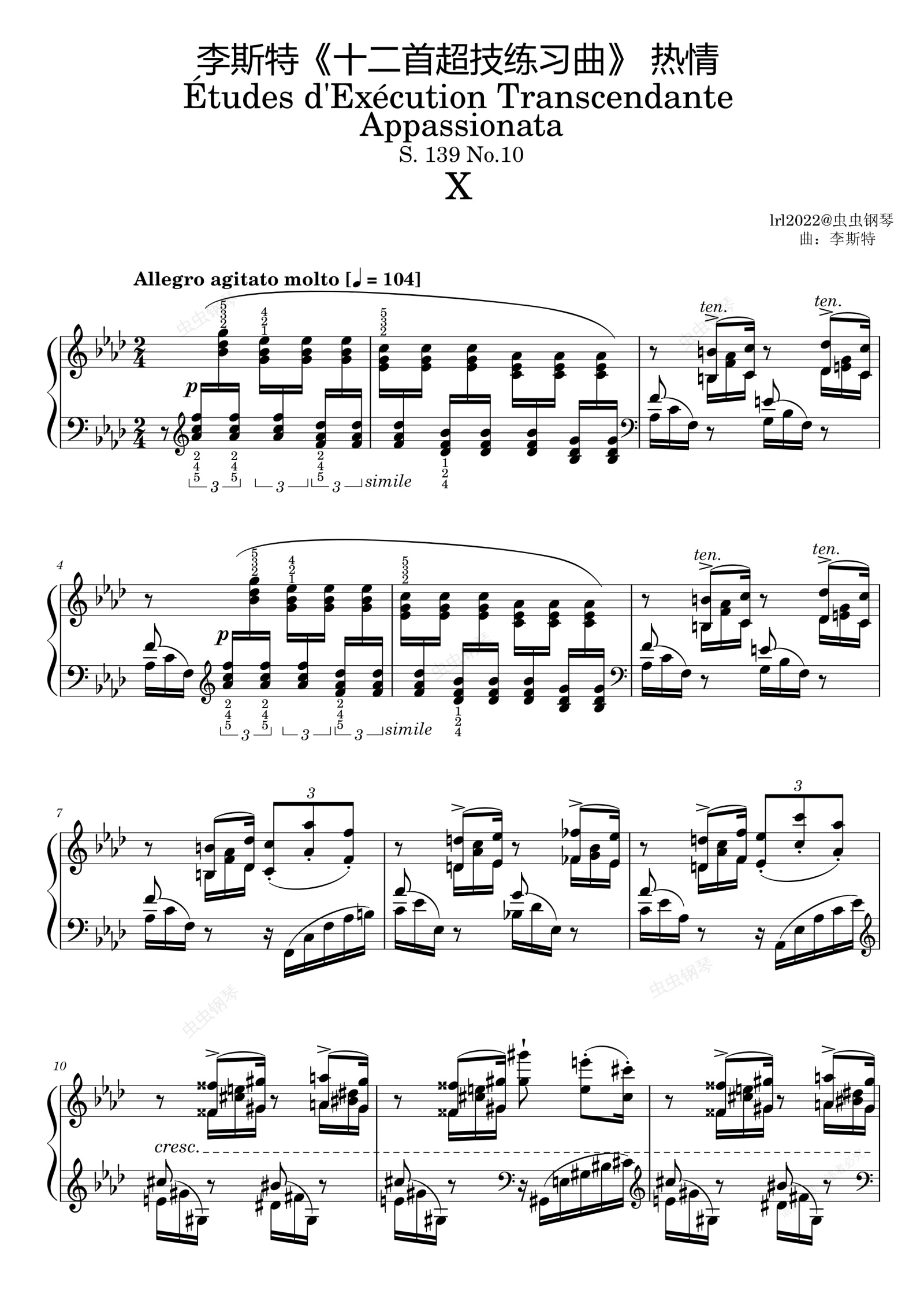 钢琴谱:Liszt 李斯特《十二首超技练习曲》 热情 S.139 No.10 原版 高清 指法 Transcendental tude No.10 Appassionata
