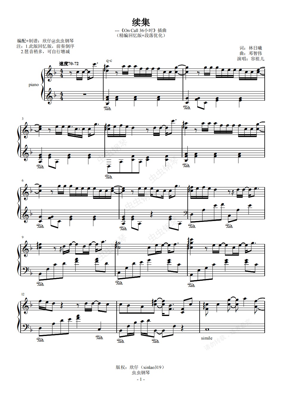 钢琴谱:容祖儿-F《续集》(《On Call 36小时》插曲、段落优化)