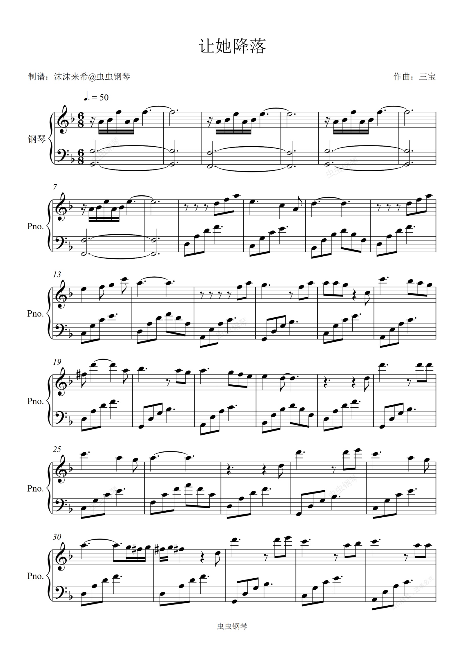 钢琴谱:《让她降落》F调 唯美初学者 (电视剧《金粉世家》片尾曲)