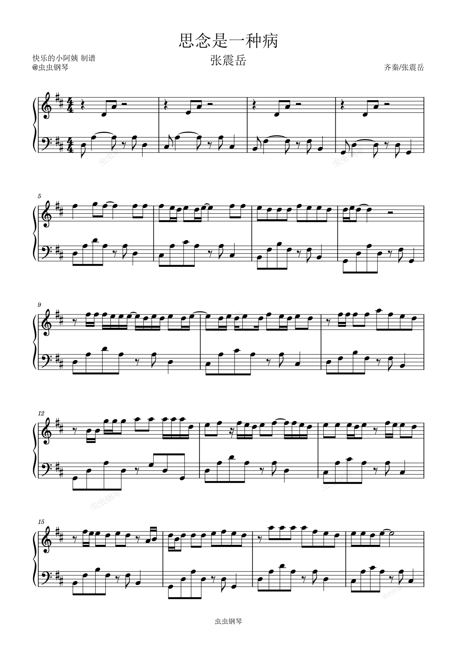 钢琴谱:思念是一种病(D大调,张震岳)