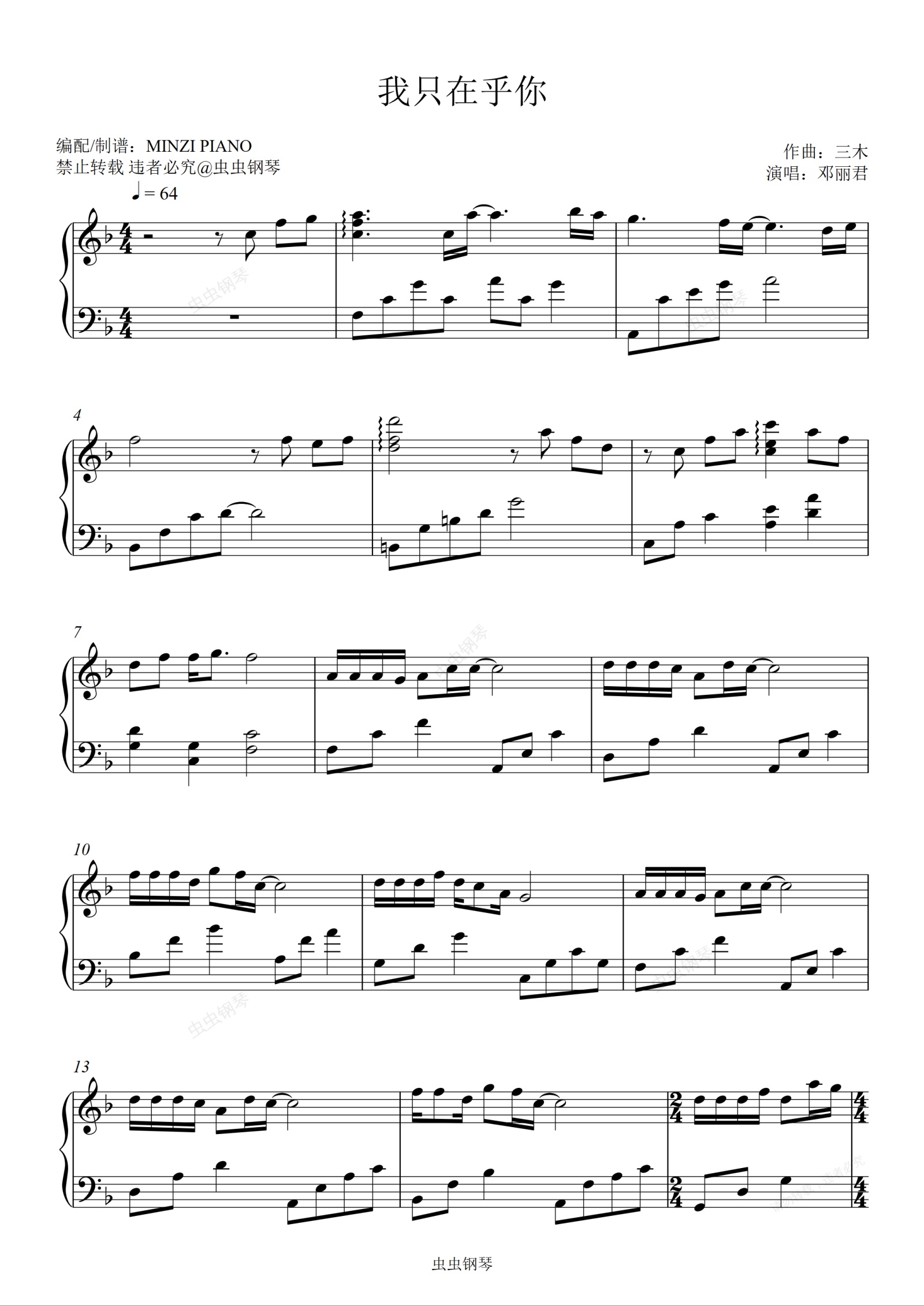 钢琴谱:我只在乎你-邓丽君 原调F