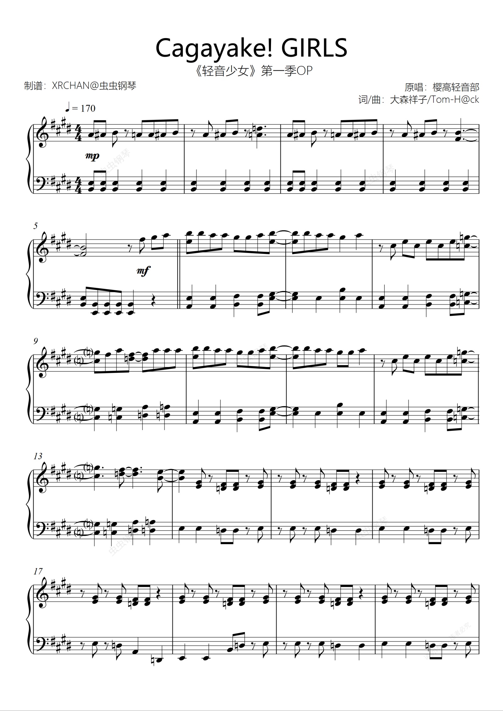 钢琴谱:Cagayake! GIRLS《轻音少女》第一季OP 初级