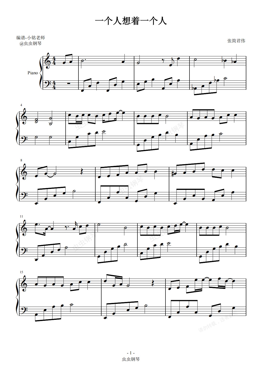 钢琴谱:一个人想着一个人 【简易 动听】