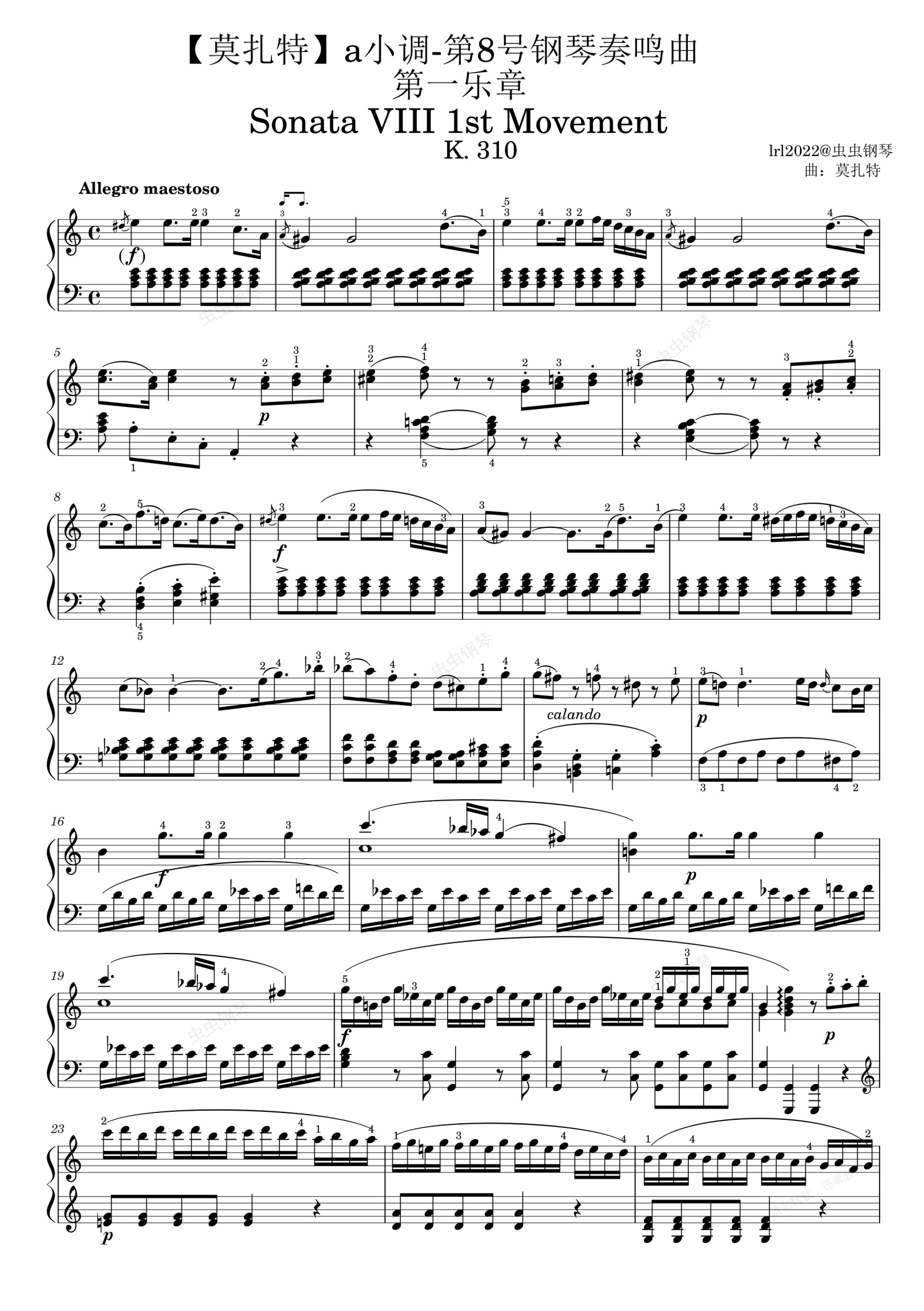 钢琴谱:【莫扎特】a小调-第8号钢琴奏鸣曲-K.310-第一乐章-原版 高清带指法-Sonata No.8 1st Movement-Mozart