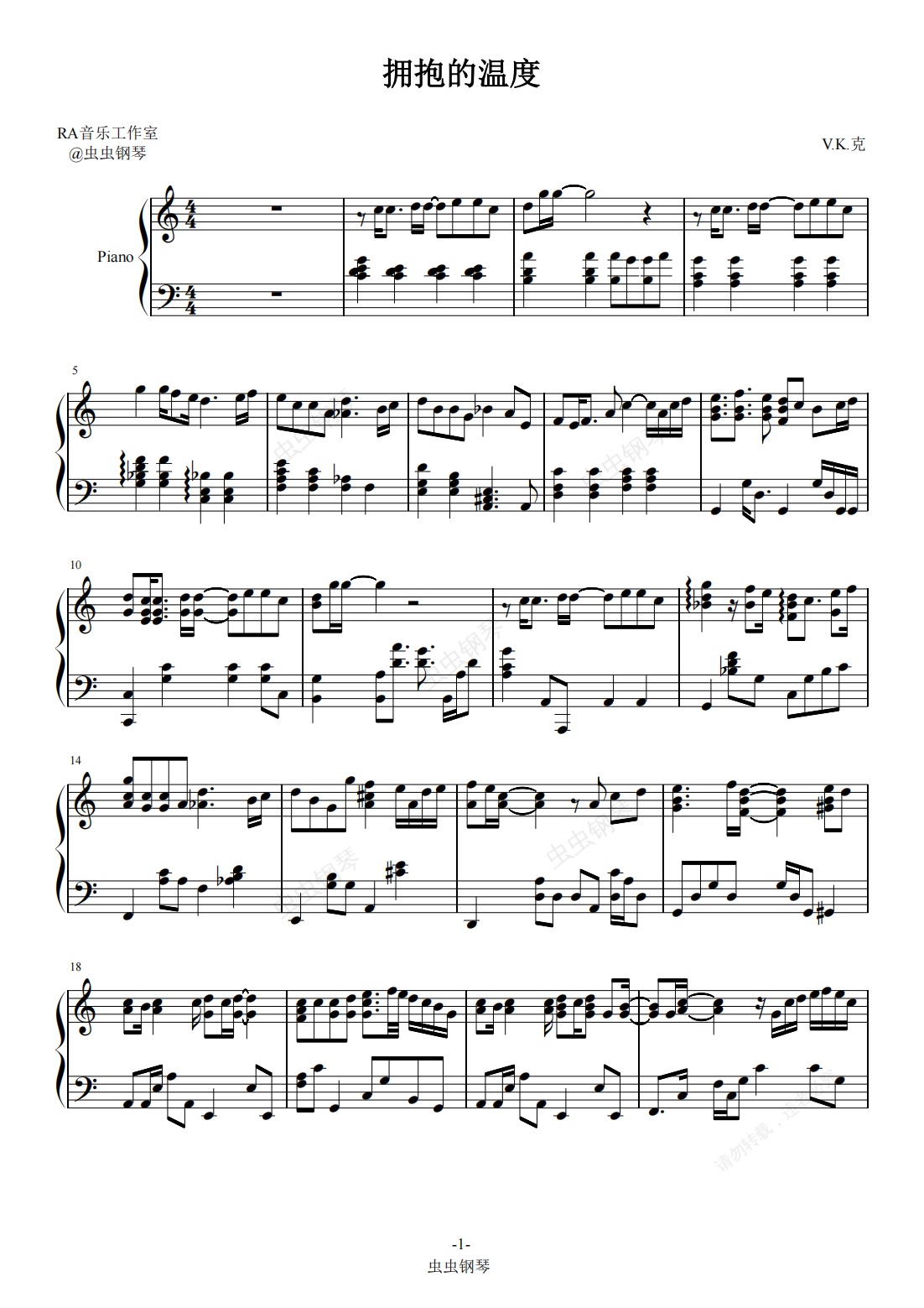 钢琴谱:拥抱的温度-V.K克-纯钢琴演奏谱 C 调