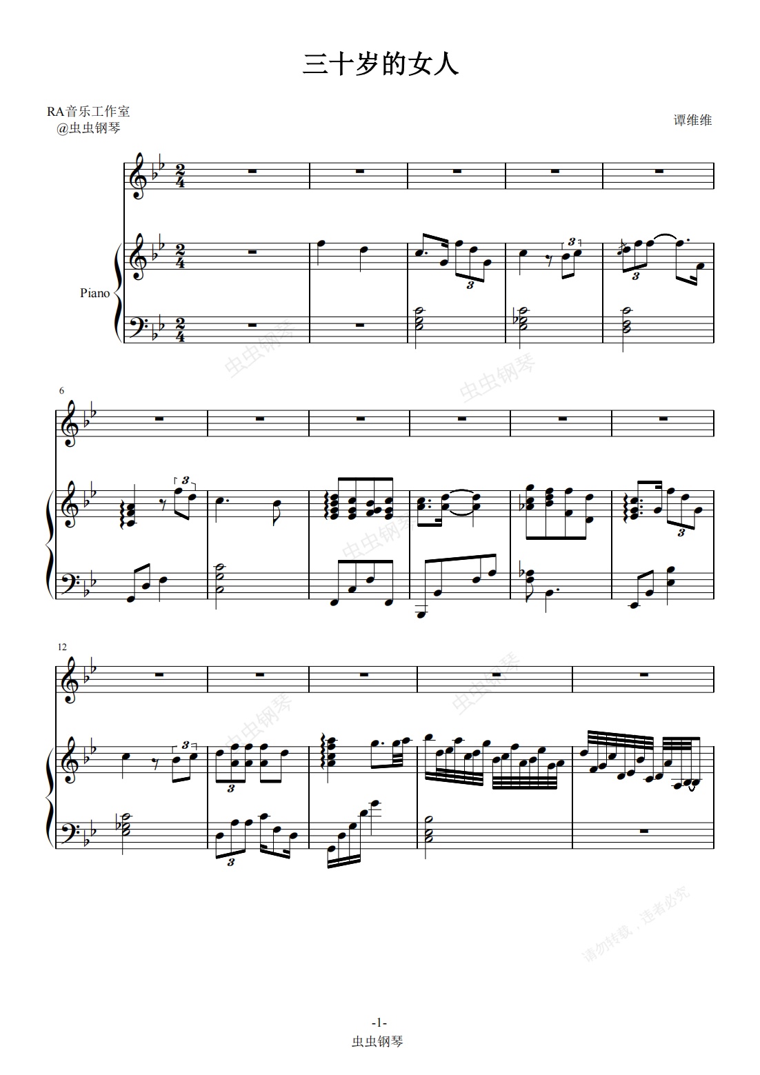 钢琴谱:《三十岁的女人》-谭维维-钢琴伴奏谱 蒙面歌王版