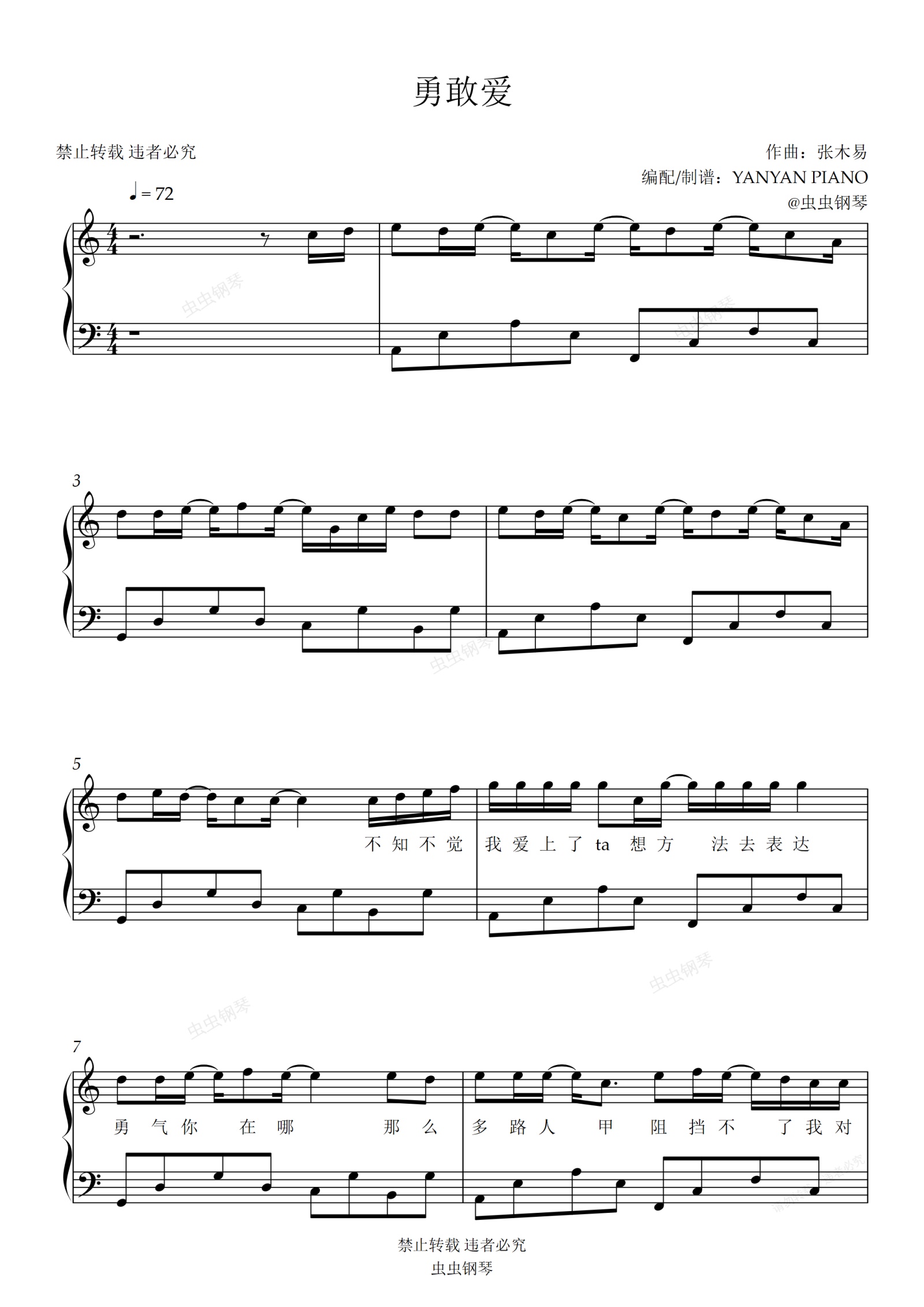钢琴谱:好听易弹【勇敢爱】Mi2(张木易张千巽)