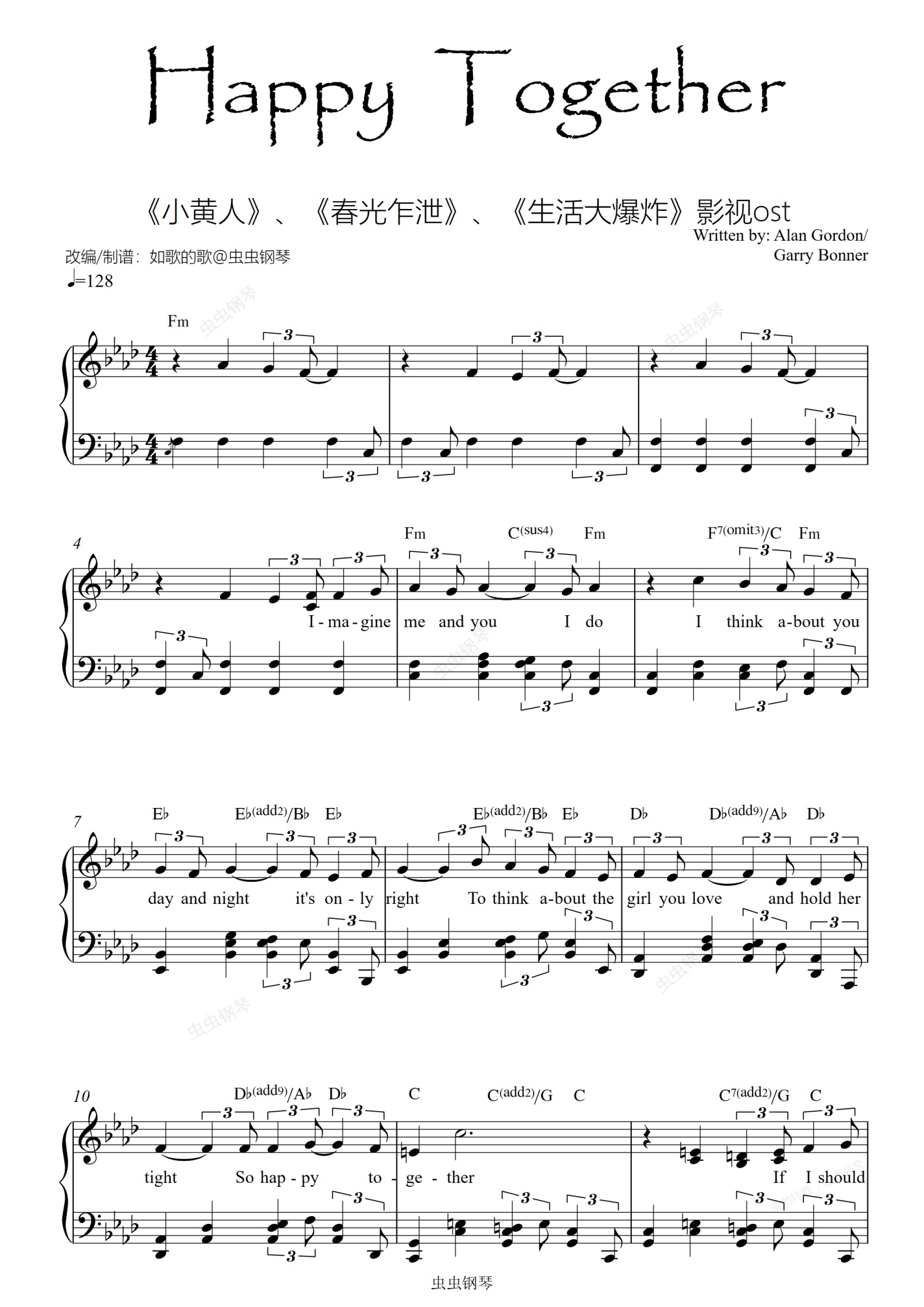 钢琴谱:Happy Together可弹唱《小黄人》《春光乍泄》《生活大爆炸》ost