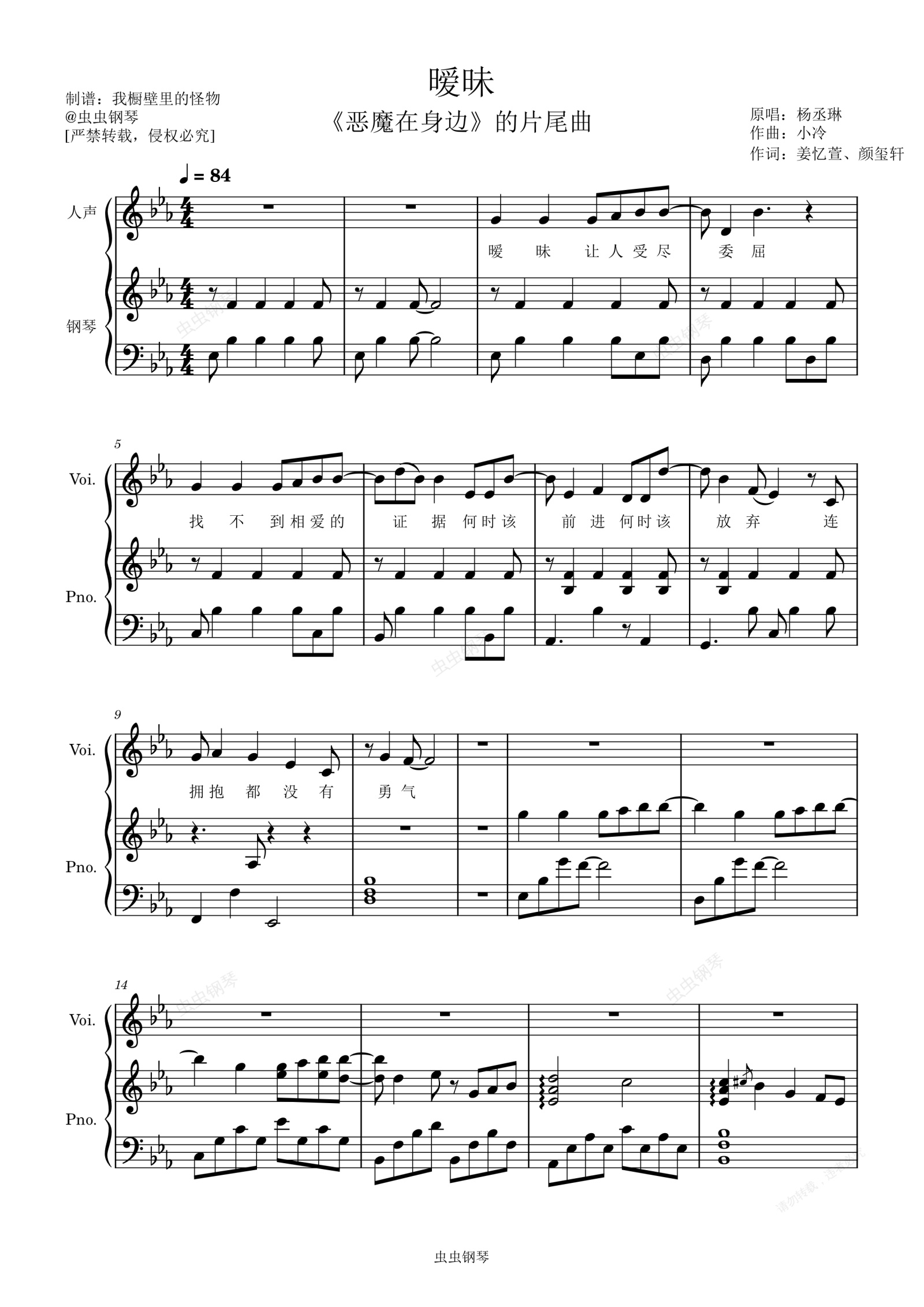 钢琴谱:暧昧【高度还原弹唱谱】「怪物」