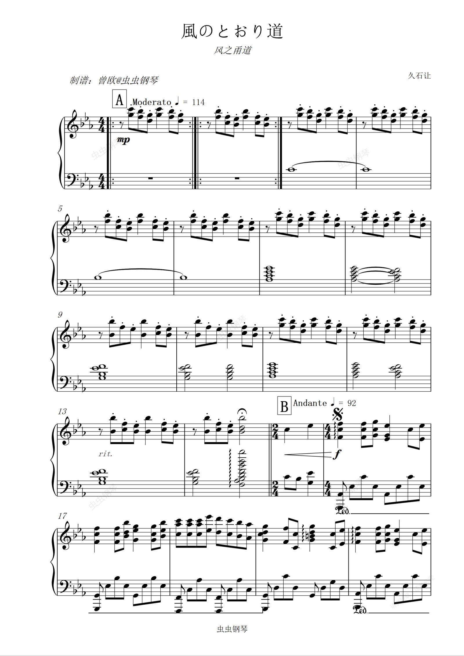钢琴谱:風のとおり道(风之甬道)- 久石让 (《龙猫》原声带)