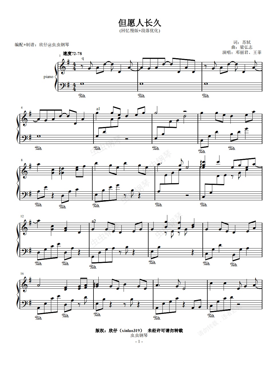 钢琴谱:G《但愿人长久》(慢版回忆+段落优化、邓丽君、王菲)