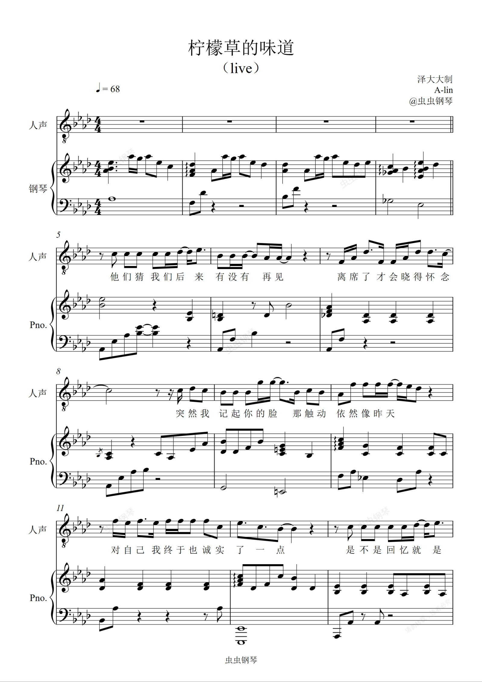 钢琴谱:柠檬草的味道【Live精编弹唱附词】泽大大 A-Lin