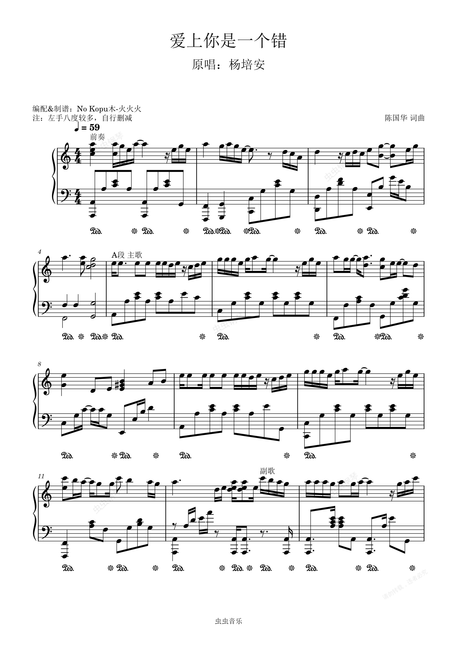 钢琴谱:C调 爱上你是一个错 贴合原版