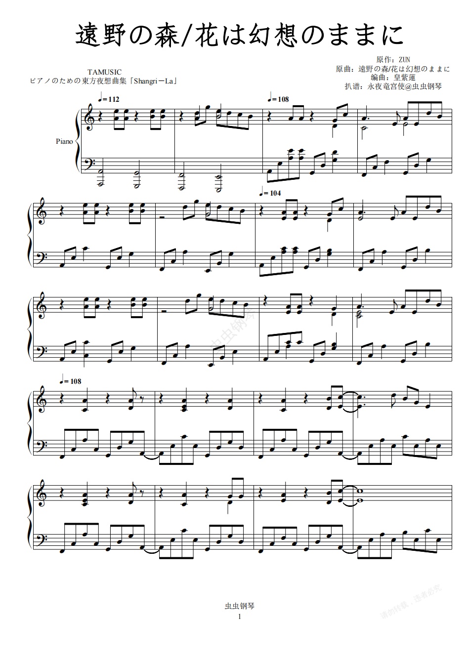 大家好,我是永夜竜宫使,这次带来的是在2009年推出的专辑《ピアノのための東方夜想曲集「-La」》最后一曲《遠野の森 ~ 花は幻想のままに》,原曲分别是ZUN黑历史第二作《东方封魔录 ~ the Story of》中的bad end曲《遠野の森》以及第九作《东方花映塚 ~ of View》中曲《花は幻想のままに》。尽管遠野之森的旋律伴随着一种不安定感,但后半花似幻想的旋律终究还是呈现出令人安心的氛围。