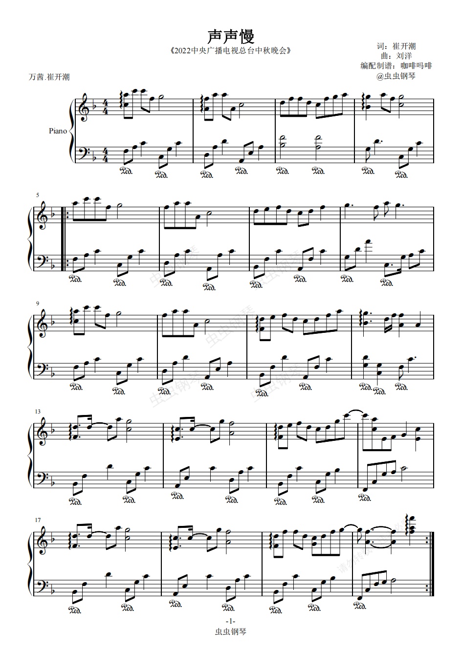 钢琴谱:声声慢-万茜.崔开潮 F调独奏谱