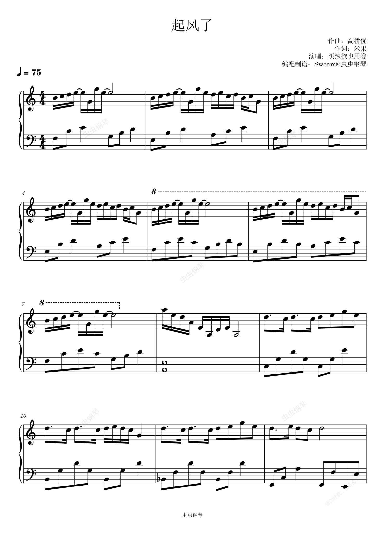 钢琴谱:起风了(C调简易版)