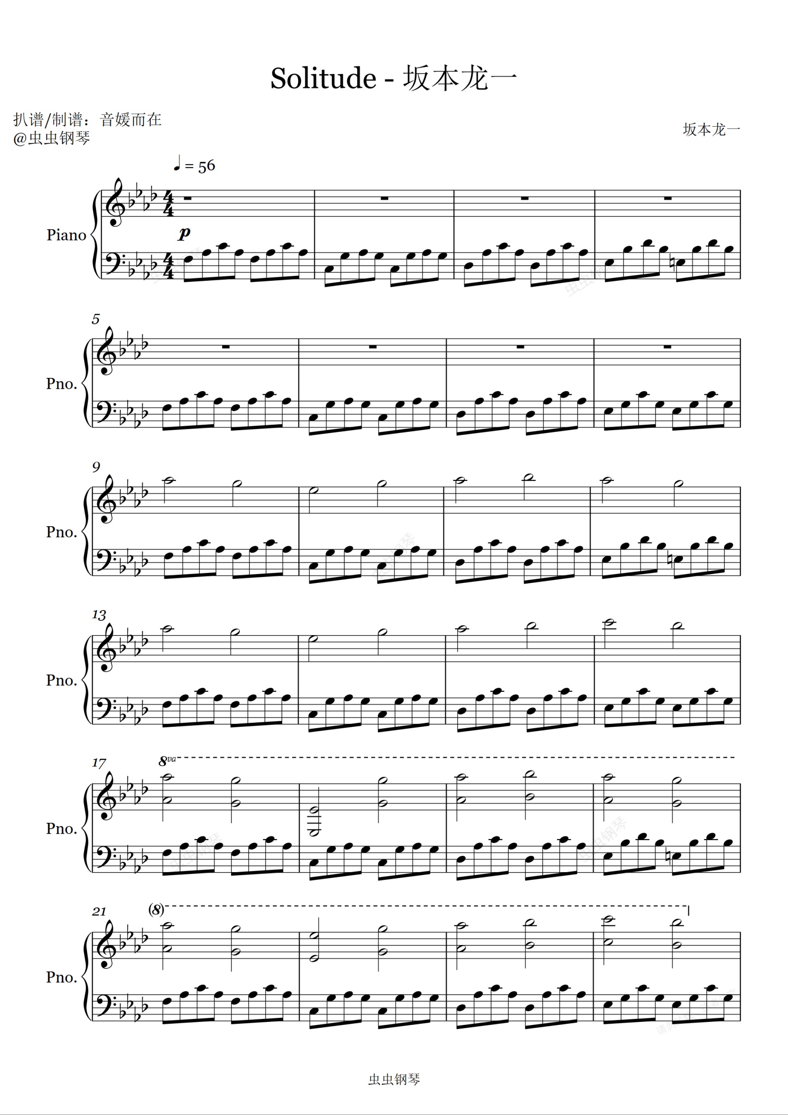 钢琴谱:Solitude - 坂本龙一【美丽静心的音乐/轻松的学习】