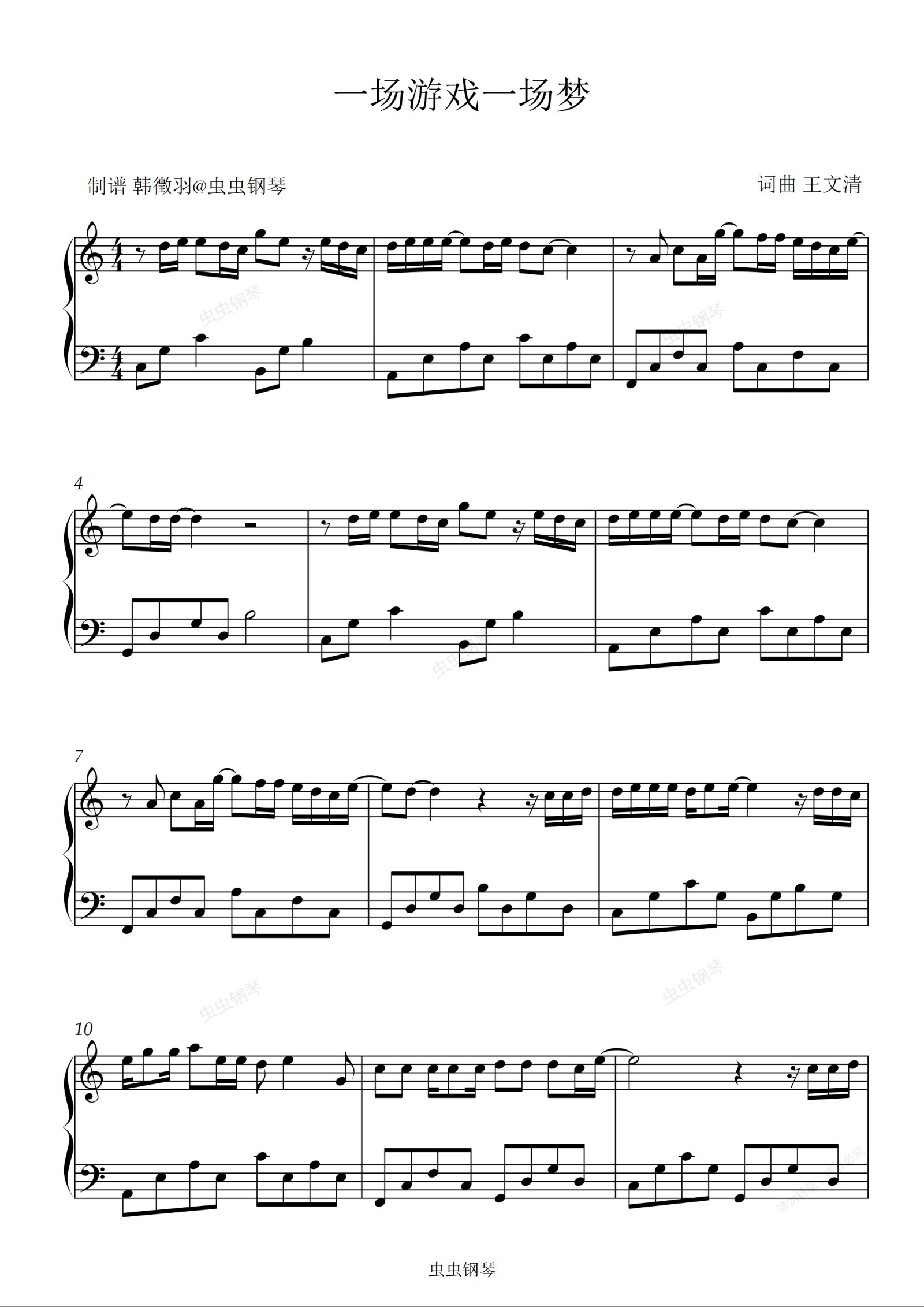 钢琴谱:王杰 一场游戏一场梦 C调简单易弹