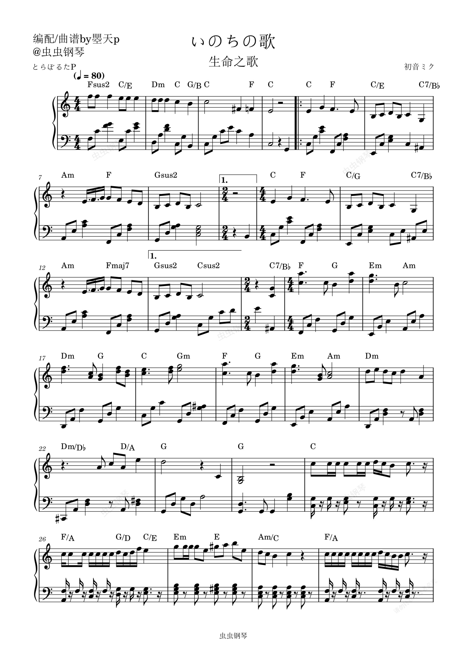 钢琴谱:いのちの歌(生命之歌)C调谱