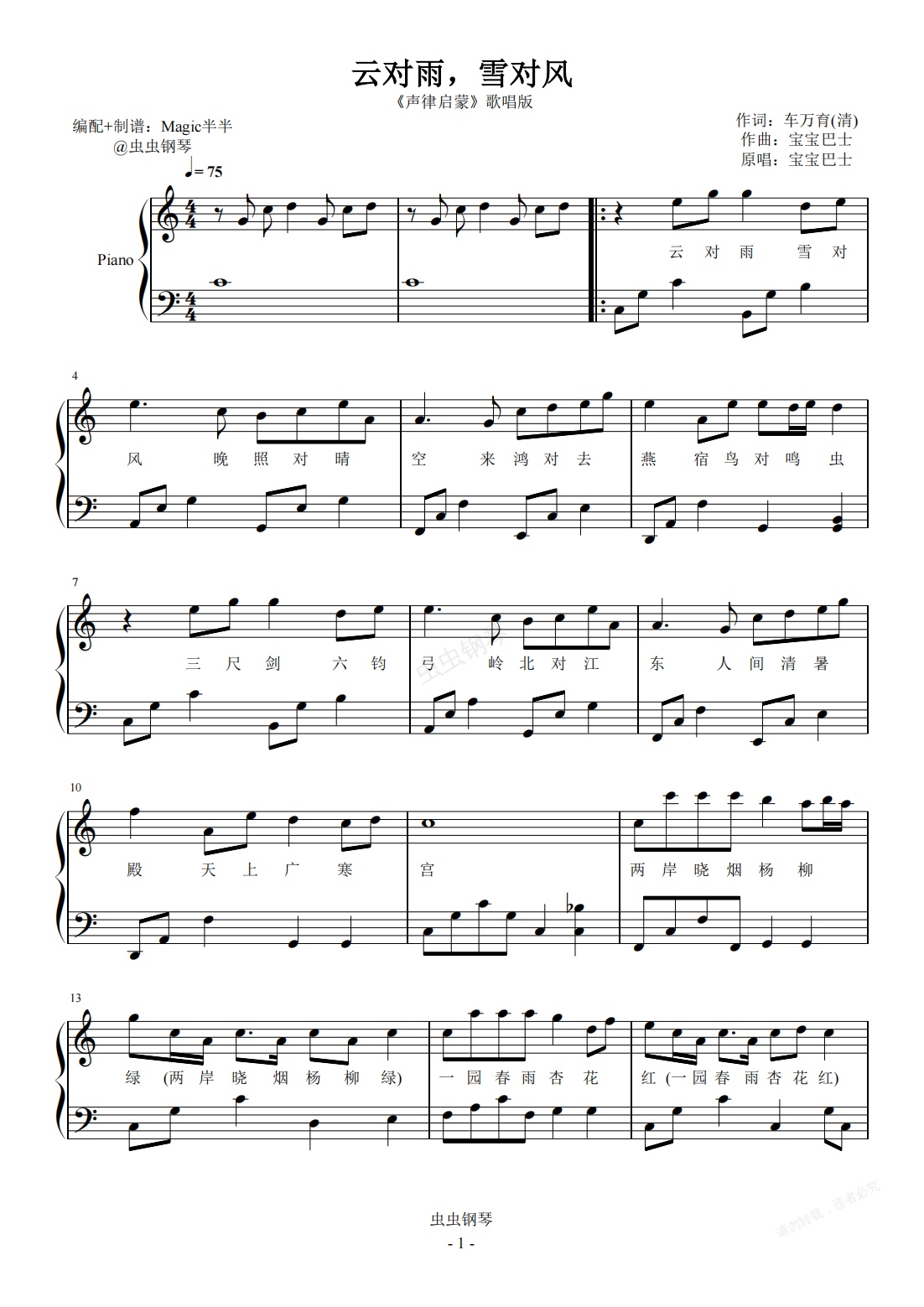 钢琴谱:云对雨雪对风 (国学声律启蒙)