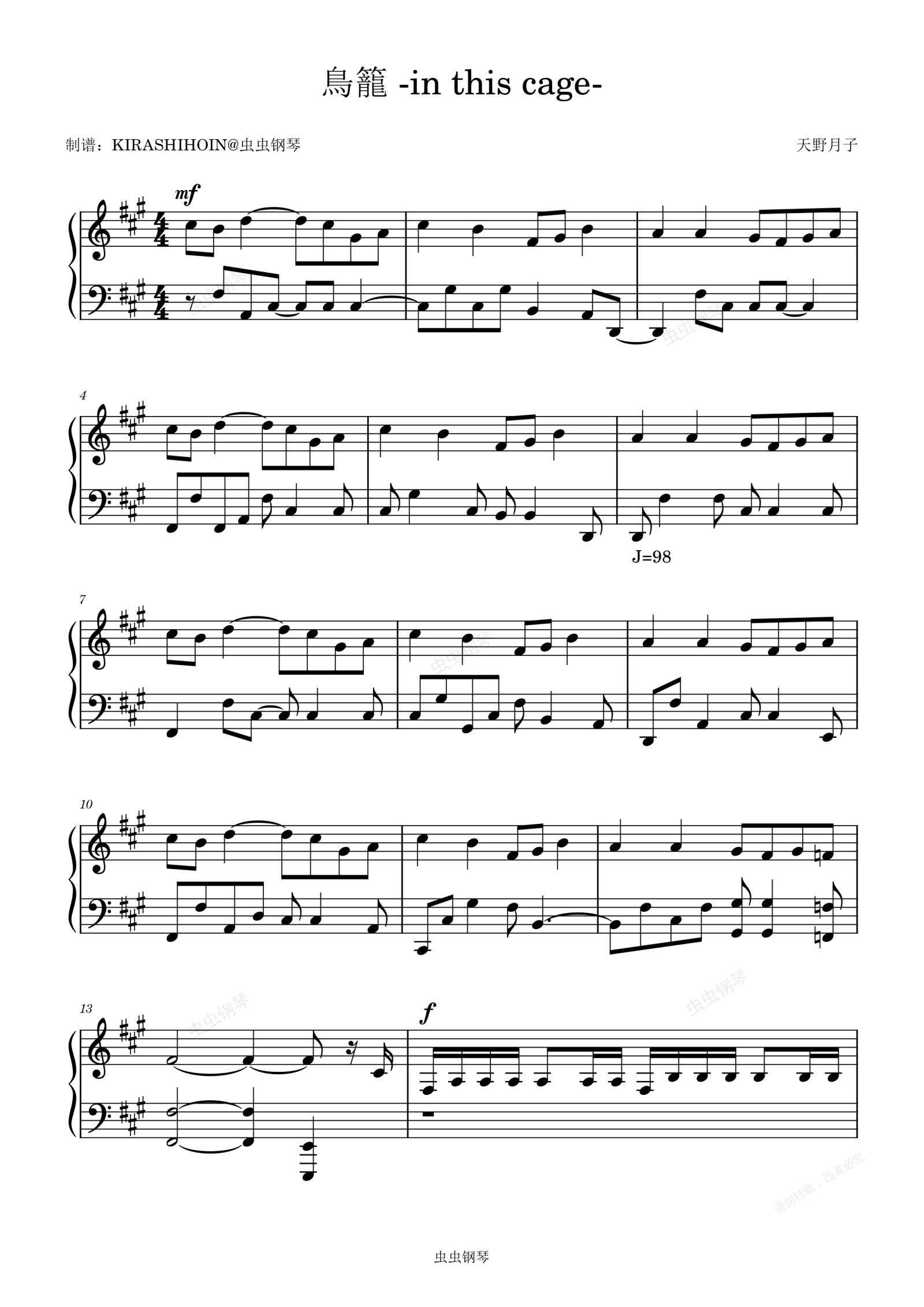 钢琴谱:鳥籠 -in this cage-(《零:濡鸦之巫女》ED/片尾曲)- 天野月