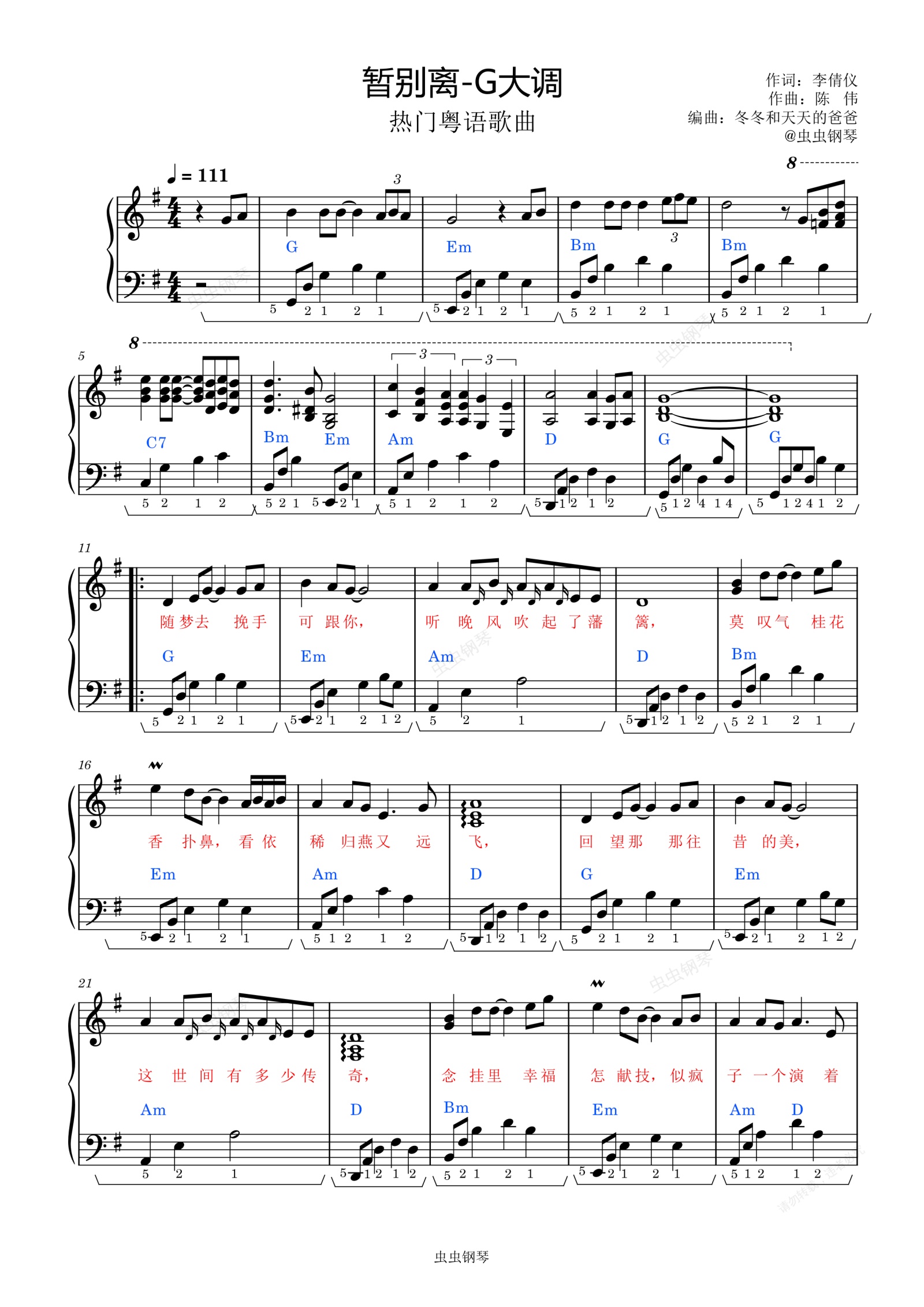 钢琴谱:暂别离-热门粤语歌曲(带指法)G大调